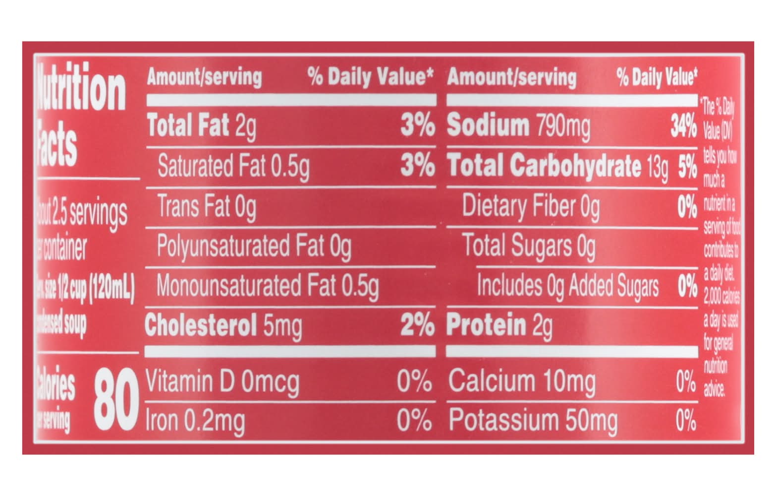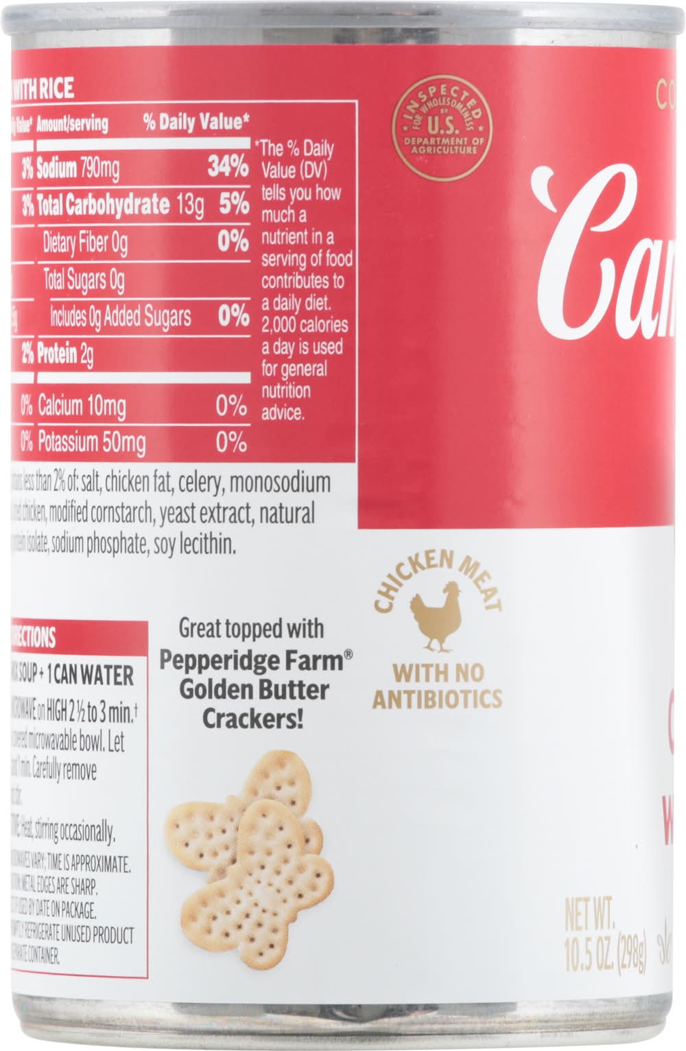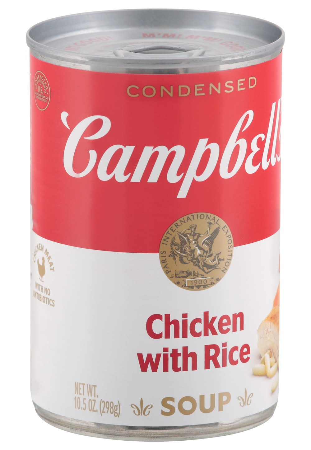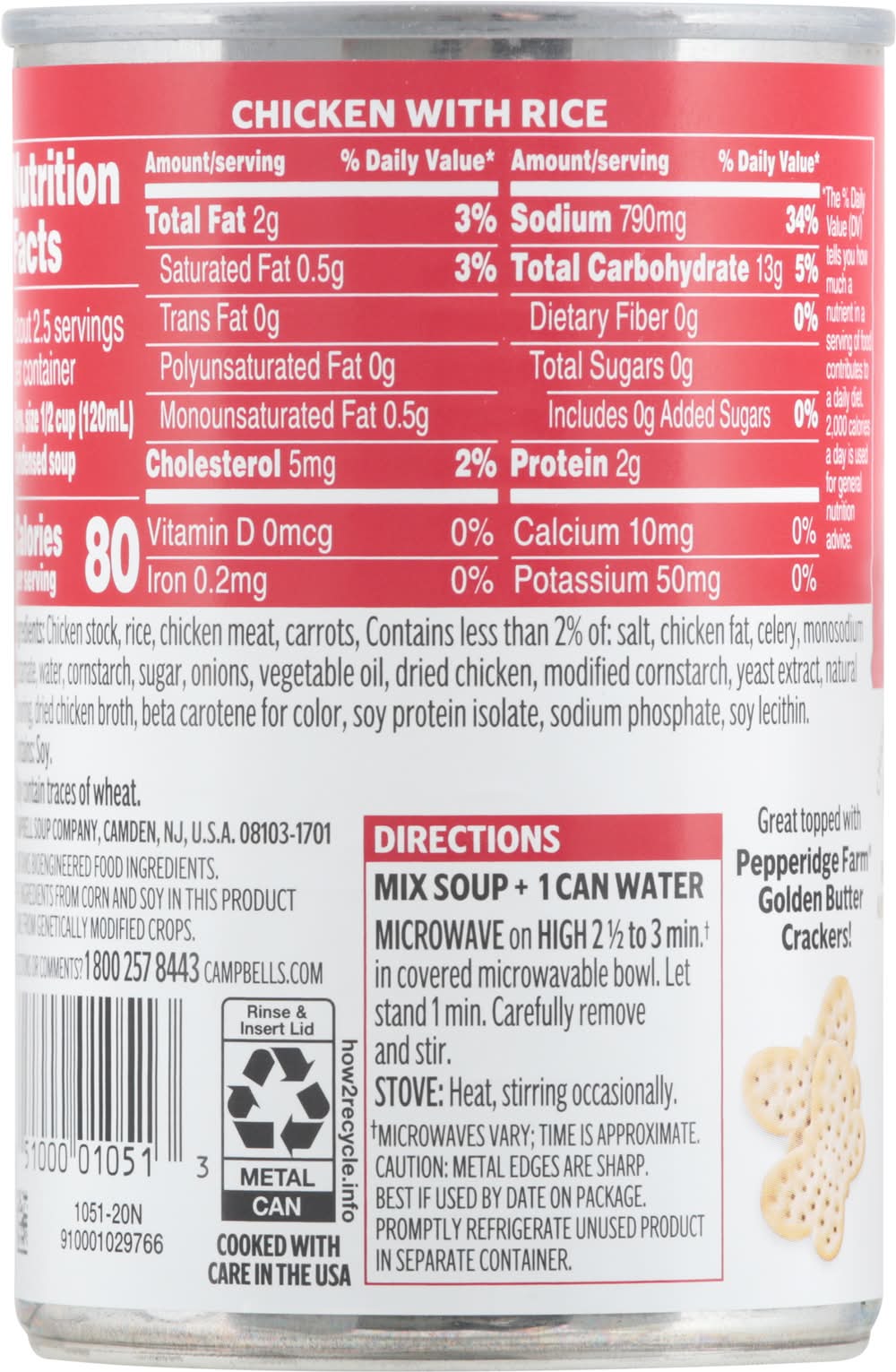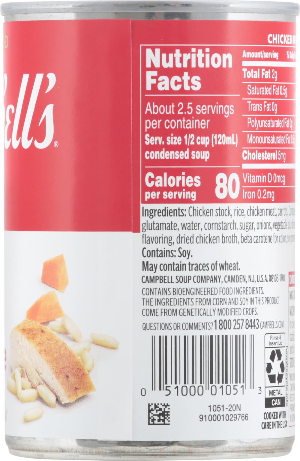 No artificial flavors. 80 calories per 1/2 cup. Chicken meat with no antibiotics. No preservatives added. Low in fat and cholesterol. The ingredients from corn, soy and sugar in this product come from genetically modified crops. • Brand: Campbell's • Flavor: Chicken-rice • Campbell Soup Company, Camden,NJ,USA • Packaging: Reusable