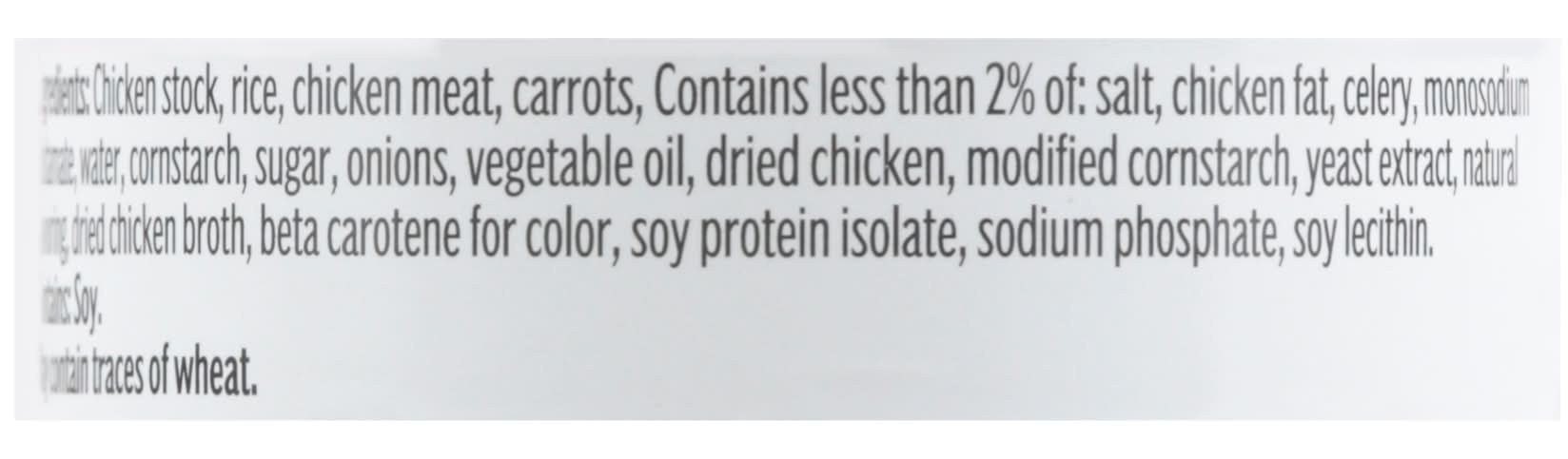 Ingredients: Chicken Stock, Rice, Chicken Meat, Carrots, Contains Less than 2% of: Salt, Chicken Fat, Celery, Monosodium Glutamate, Water, Cornstarch, Sugar, Onions, Vegetables Oil, Dried Chicken, Modified Cornstarch, Yeast Extract, Natural Flavoring, Dried Chicken Broth, Beta Carotene for Color, Soy Protein Isolate, Sodium Phosphate, Soy Lecithin Contains: Wheat, Soybeans, Celery, Corn