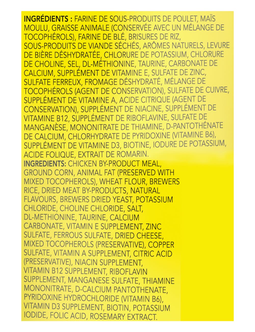 Ingredients: Chicken By-Product Meal, Ground Corn, Animal Fat (Preserved with Mixed Tocopherols), Wheat Flour, Brewers Rice, Dried Meat By-Products, Natural Flavours, Brewers Dried Yeast, Potassium Chloride, Choline Chloride, Salt, DL-Methionine, Taurine, Calcium Carbonate, Vitamin E Supplement, Zinc Sulfate, Ferrous Sulfate, Dried Cheese, Mixed Tocopherols (Preservative), Copper Sulfate, Vitamin A Supplement, Citric Acid (Preservative), Niacin Supplement, Vitamin B12 Supplement, Riboflavin Supplement, Manganese Sulfate, Thiamine Mononitrate, D-Calcium Pantothenate, Pyridoxine Hydrochloride (Vitamin B6), Vitamin D3 Supplement, Biotin, Potassium Iodide, Folic Acid, Rosemary Extract Contains: Corn, Wheat