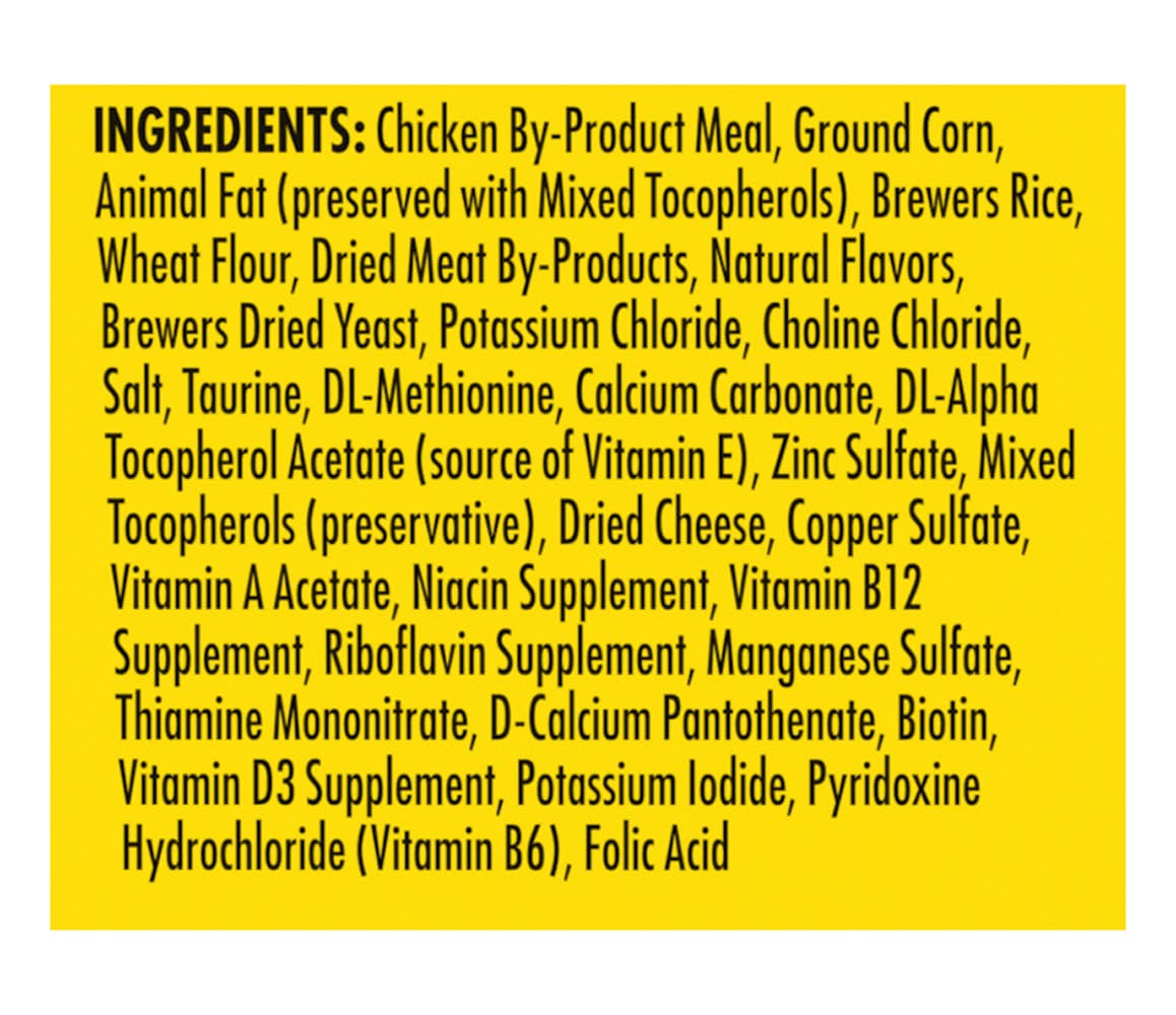 Ingredients: Chicken By-Product Meal, Ground Corn, Animal Fat (Preserved with Mixed Tocopherols), Brewers Rice, Wheat Flour, Dried Meat By-Products, Natural Flavors, Brewers Dried Yeast, Potassium Chloride, Choline Chloride, Salt, Taurine, DL-Methionine, Calcium Carbonate, DL-Alpha Tocopherol Acetate (Source of Vitamin E), Zinc Sulfate, Mixed Tocopherols (Preservative), Dried Cheese, Copper Sulfate, Vitamin A Acetate, Niacin Supplement, Vitamin B12 Supplement, Riboflavin Supplement, Manganese Sulfate, Thiamine Mononitrate, D-Calcium Pantothenate, Biotin, Vitamin D3 Supplement, Potassium Iodide, Pyridoxine Hydrochloride (Vitamin B6), Folic Acid
