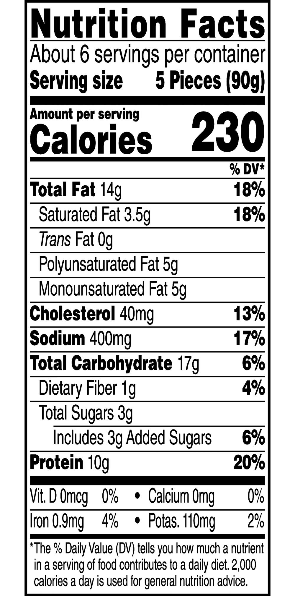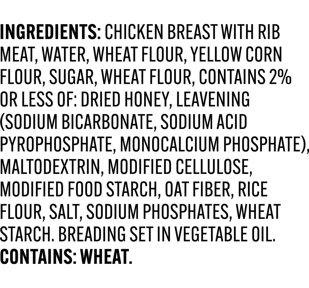Ingredients: Chicken Breast With Rib Meat, Water, Wheat Flour, Yellow Corn Flour, Sugar, Wheat Flour, Contains 2% or Less of: Dried Honey, Leavening (Sodium Bicarbonate, Sodium Acid Pyrophosphate, Monocalcium Phosphate), Maltodextrin, Modified Cellulose, Modified Food Starch, Oat Fiber, Rice Flour, Salt, Sodium Phosphates, Wheat Starch. Breading Set in Vegetable Oil. Contains: Wheat