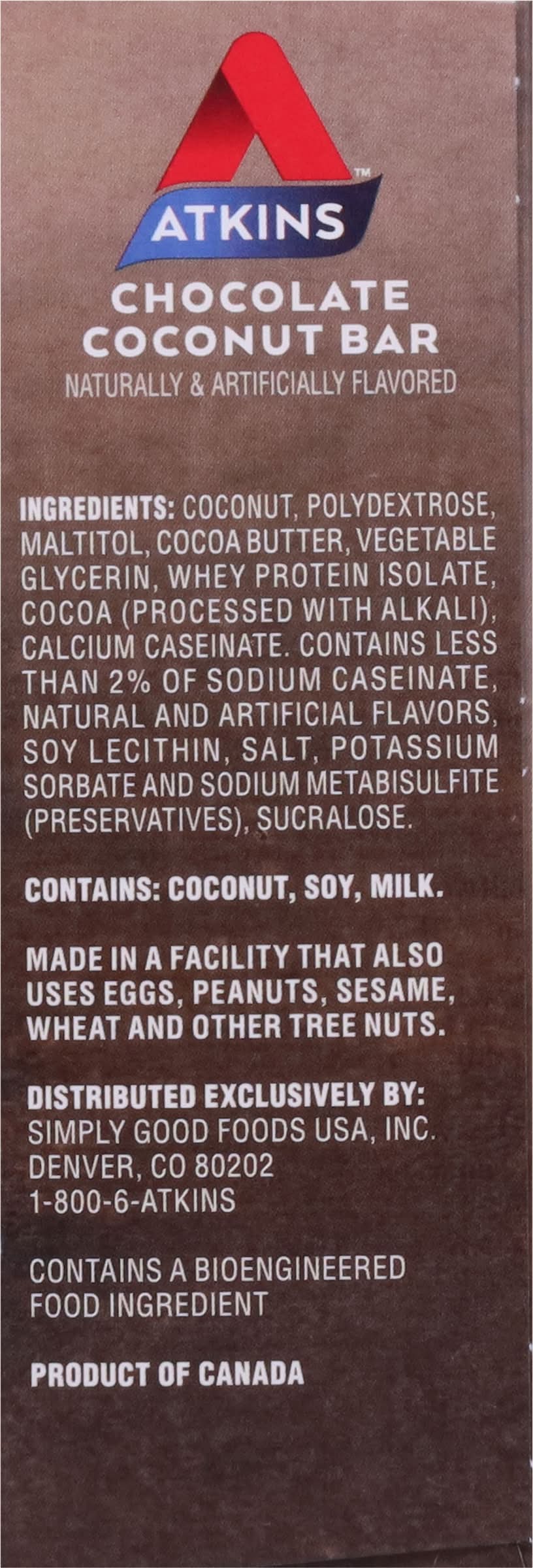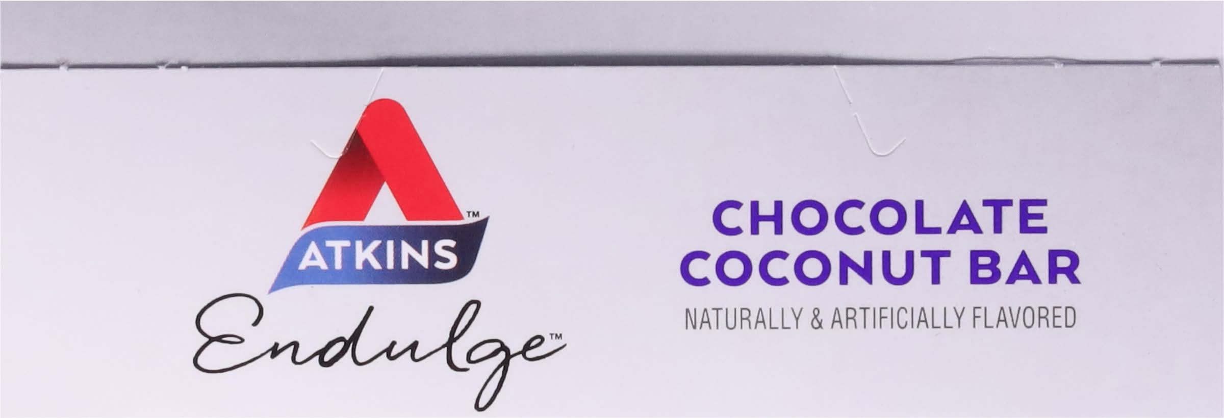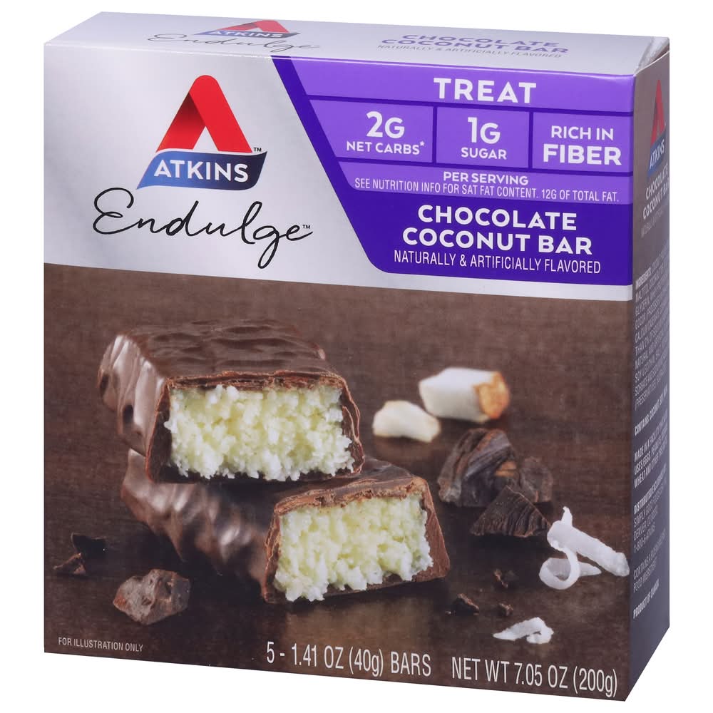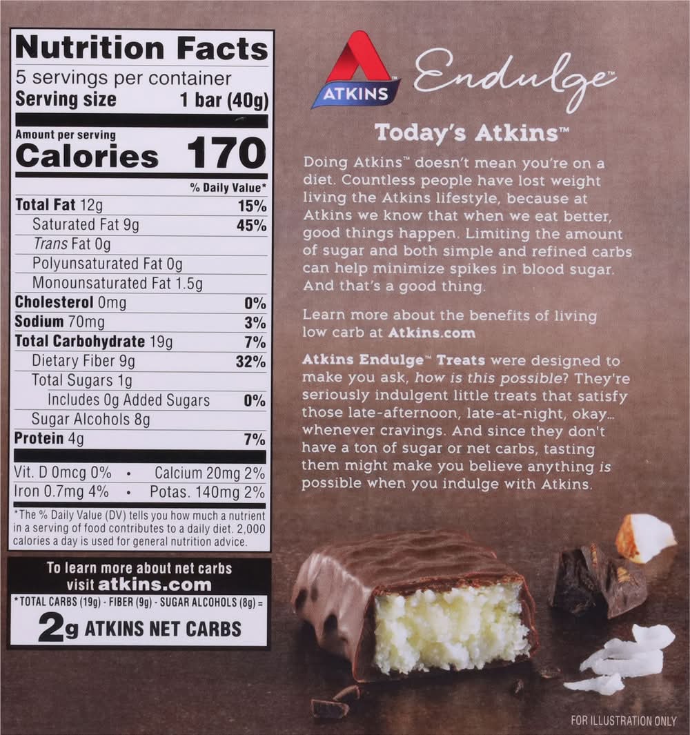 Naturally & artificially flavored. Rich in fiber. See nutrition information for sat fat content. Contains a bioengineered food ingredient. Today's Atkins: Doing Atkins doesn't mean you're on a diet. Countless people have lost weight living the Atkins lifestyle, because at Atkins we know that when we eat better, good things happen. Limiting the amount of sugar and both simple and refined carbs can help minimize spikes in blood sugar And that's a good thing. Atkins Endulge Treats were designed to make you ask, how is this possible? They're seriously indulgent little treats that satisfy those late-afternoon, late-at-night, okay whenever cravings. And since they don't have a ton of sugar or net carbs, tasting them might make you believe anything is possible when you indulge with Atkins. Today's Atkins is all about great tasting food to help you live your best life. Today's meal (Meal Replacement Bar) Bars: Protein-rich bars to keep you satisfied at meal time. Anytime Snacks: Chewy, crunchy, sweet & salty snacks anytime anywhere. Endulge: Treats so indulgent, it's hard to believe they fit your low carb lifestyle. Recyclable paperboard packaging. Sustainable Forestry Initiative: Certified sourcing. Product of Canada. • Flavor: Chocolate-coconut • Pack size: 5 • Packaging: Reusable