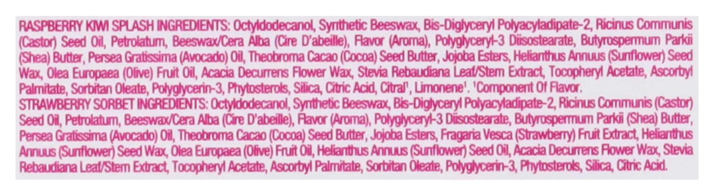 Ingredients: Raspberry Kiwi Splash : Raspberry Kiwi Splash Ingredients: Octyldodecanol, Synthetic Beeswax, Bis-Diglyceryl Polyacyladipate-2, Ricinus Communis (Castor) Seed Oil, Petrolatum, Beeswax/Cera Alba (Cire D'abeille), Flavor (Aroma), Polyglyceryl-3 Diisostearate, Butyrospermum Parkii (Shea) Butter, Persea Gratissima (Avocado) Oil, Theobroma Cacao (Cocoa) Seed Butter, Jojoba Esters, Helianthus Annuus (Sunflower) Seed Wax, Olea Europaea (Olive) Fruit Oil, Acacia Decurrens Flower Wax, Stevia Rebaudiana Leat/Stem Extract, Tocopheryl Acetate, Ascorbyl Palmitate, Sorbitan Oleate, Polyglycerin-3, Phytosterols, Silica, Citric Acid, Citral(1), Limonene(1). (1)Component of Flavor. Strawberry Sorbet : Strawberry Sorbet Ingredients: Octyldodecanol, Synthetic Beeswax, Bis-Diglyceryl Polyacyladipate-2, Ricinus Communis (Castor) Seed Oil, Petrolatum, Beeswax/Cera Alba (Cire D'abeille), Flavor (Aroma), Polyglyceryl-3 Diisostearate, Butyrospermum Parkii (Shea) Butter, Persea Gratissima (Avocado) Oil, Theobroma Cacao (Cocoa) Seed Butter, Jojoba Esters, Fragaria Vesca (Strawberry) Fruit Extract, Helianthus Annuus (Sunflower) Seed Wax, Olea Europaea (Olive) Fruit Oil, Helianthus Annuus (Sunflower) Seed Oil, Acacia Decurrens Flower Wax, Stevia Rebaudiana Leat/Stem Extract, Tocopheryl Acetate, Ascorbyl Palmitate, Sorbitan Oleate, Polyglycerin-3, Phytosterols, Silica, Citric Acid