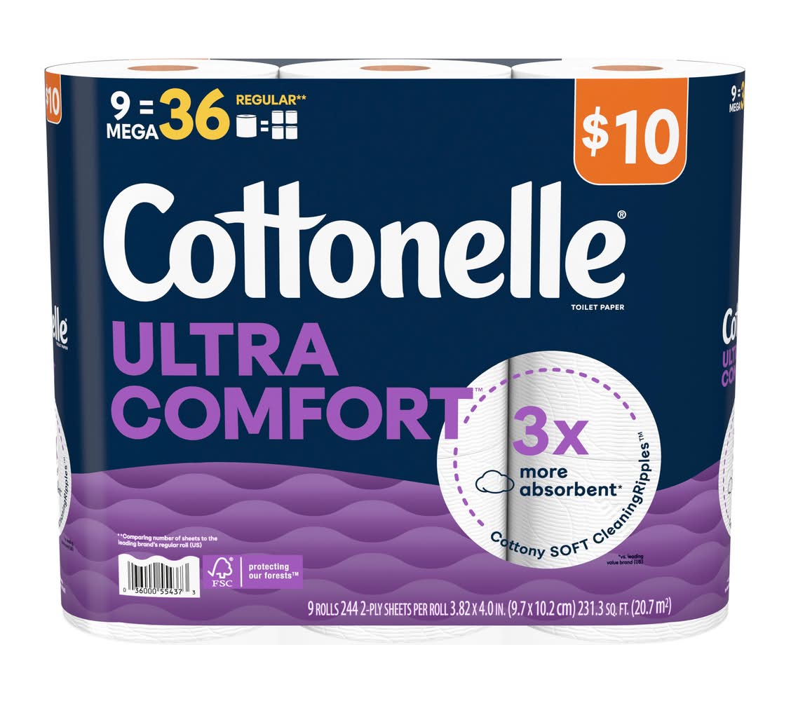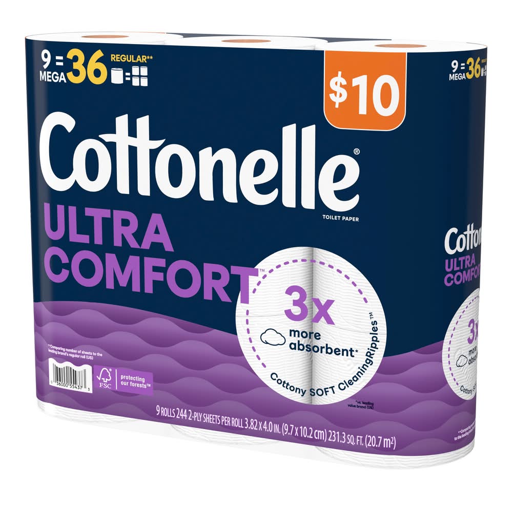 Cottonelle Ultra Comfort Toilet Paper, Strong Toilet Tissue, 9 Mega Rolls (9 Mega Rolls = 36 Regular Rolls), 244 Sheets Per Roll • Size: 3.82x4 in • Packaging: Reusable