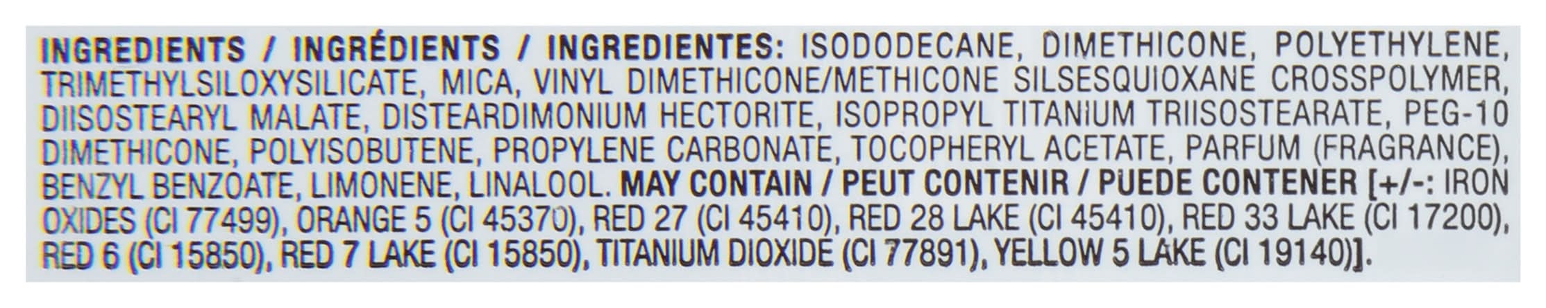 Ingredients: Isododecane, Dimethicone, Polyethylene, Trimethylsiloxysilicate, Mica, Vinyl Dimethicone/Methicone Silsesquioxane Crosspolymer, Diisostearyl Malate, Disteardimonium Hectorite, PEG-10 Dimethicone, Polyisobutene, Propylene Carbonate, Tocopheryl Acetate, Parfum (Fragrance), Benzyl Benzoate, Limonene, Linalool. May Contain/Peut Contenir/Puede Contener [+/-: Iron Oxides (CI 77499), Orange 5 (CI 45370), Red 27 (CI 45410), Red 28 Lake (CI 45410), Red 33 Lake (CI 17200), Red 6 (CI 15850), Red 7 Lake (CI 15850), Yellow 5 Lake (CI 19140)]. B02396