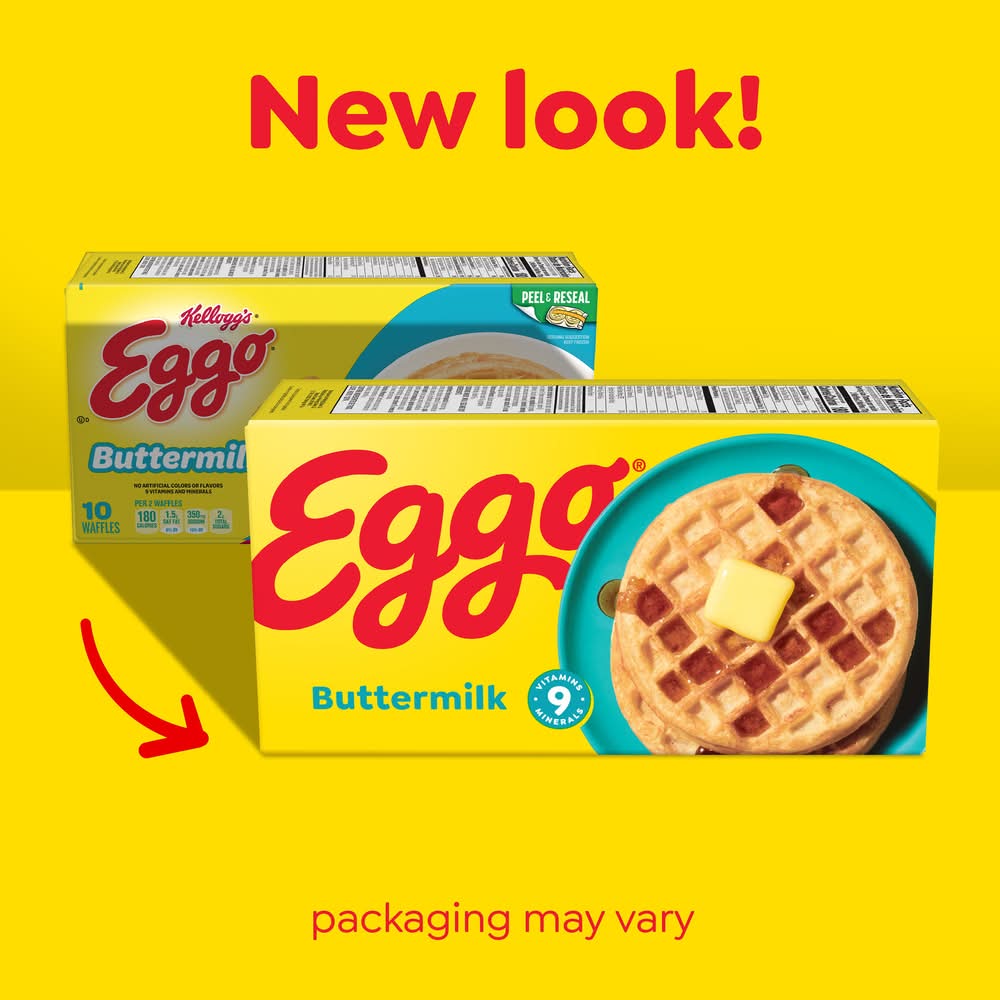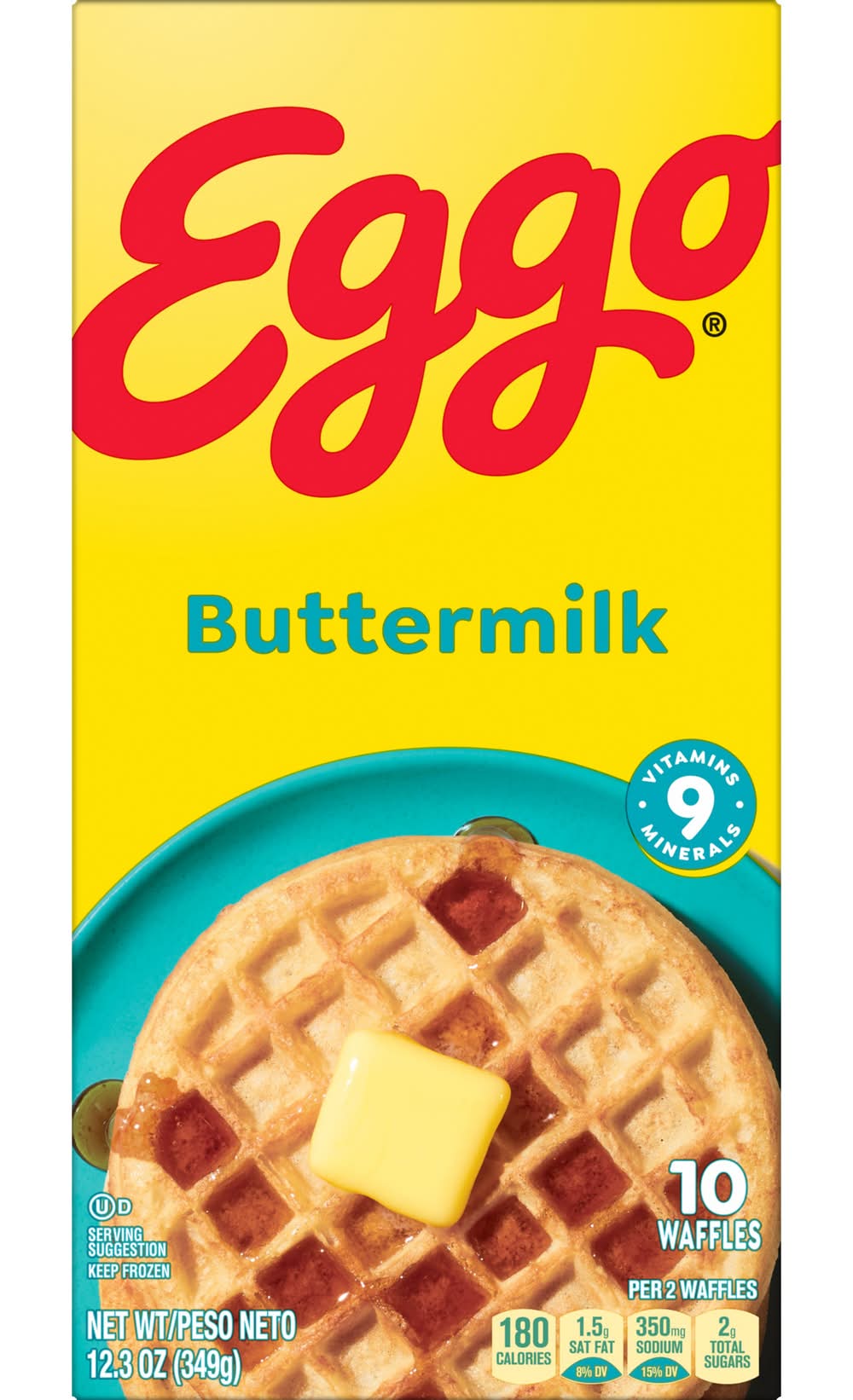 Dig into a classic with the delicious taste of Eggo Buttermilk waffles; The whole family will love the enticing aroma and sweet flavor Crisp, golden, and delightfully fluffy, these waffles have an irresistible homemade flavor and a subtly tangy buttermilk taste Good source of 9 vitamins and minerals; No artificial colors or flavors; Kosher Dairy; Contains wheat, milk, egg, and soy ingredients Quick and easy to prepare; Just pop these frozen waffles in the toaster or oven for part of a warm, Flavor: Buttermilk