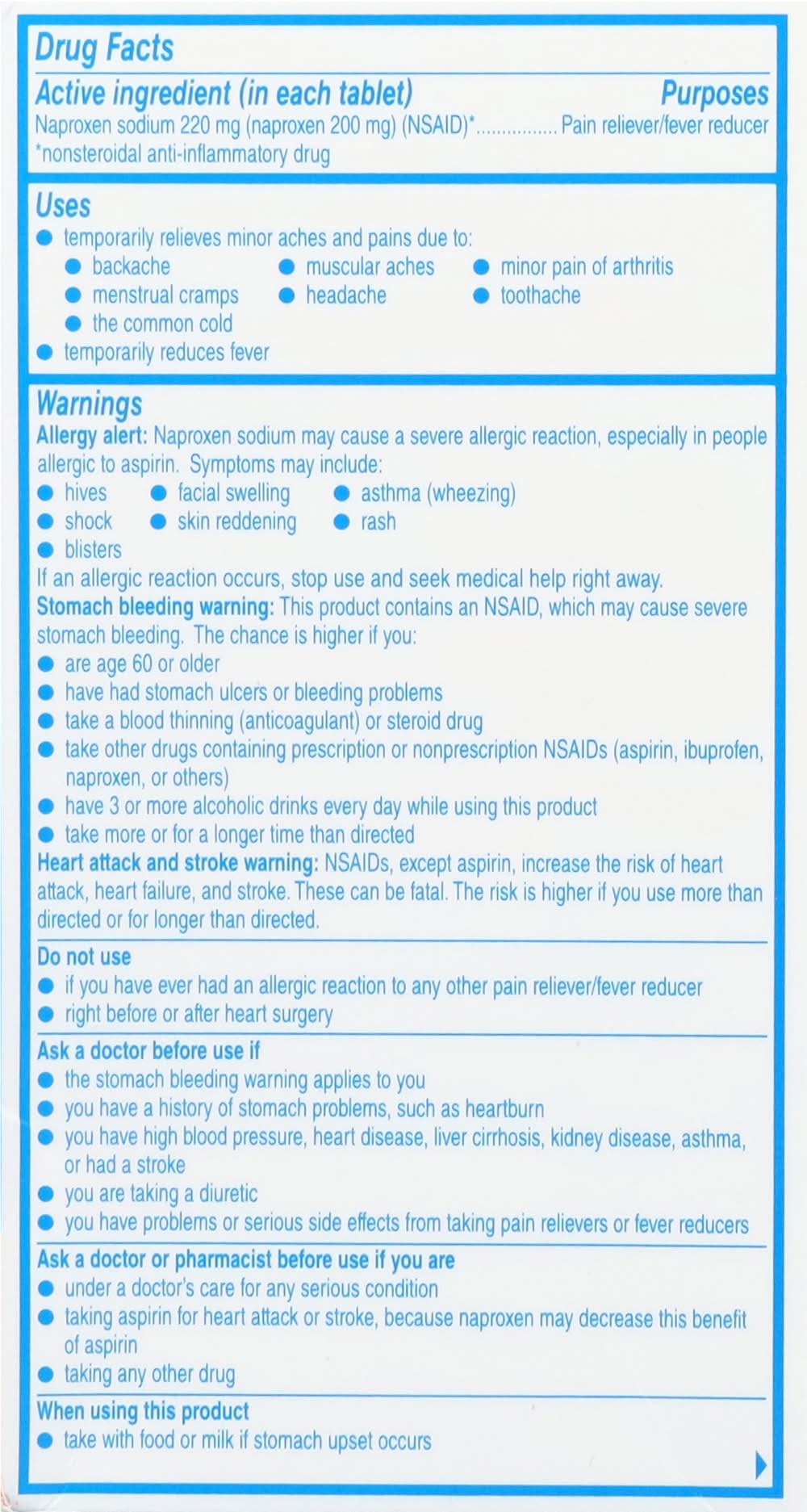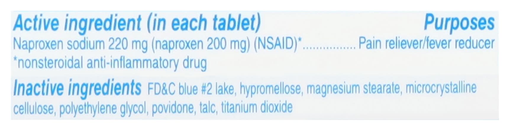 Ingredients: Active Ingredients: Naproxen sodium (naproxen 200 mg) Additives: Inactive Ingredients: FD&C blue #2 lake, Hypromellose, Magnesium Stearate, Microcrystalline Cellulose, Polyethylene Glycol, Povidone, Talc, Titanium Dioxide