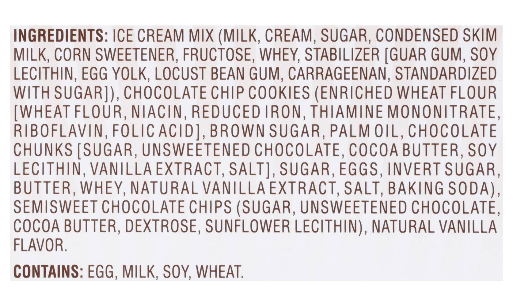 Ingredients: Ice Cream Mix (Milk Cream Sugar Condensed Skim Milk Corn Sweetener Fructose Whey Stabilizer [Guar Gum Soy Lecithin Egg Yolk Locust Bean Gum Carrageenan Standardized with Sugar]), Chocolate Chip Cookies (Enriched Wheat Flour [Wheat Flour Niacin Reduced Iron Thiamine Mononitrate Riboflavin Folic Acid] Brown Sugar Palm Oil Chocolate Chunks [Sugar Unsweetened Chocolate Cocoa Butter Soy Lecithin Vanilla Extract Salt] Sugar Eggs Invert Sugar Butter Whey Natural Vanilla Extract Salt Baking Soda), Semisweet Chocolate Chips (Sugar Unsweetened Chocolate Cocoa Butter Dextrose Sunflower Lecithin), Natural Vanilla Flavor Contains: Eggs, Milk, Soybeans, Wheat, Corn