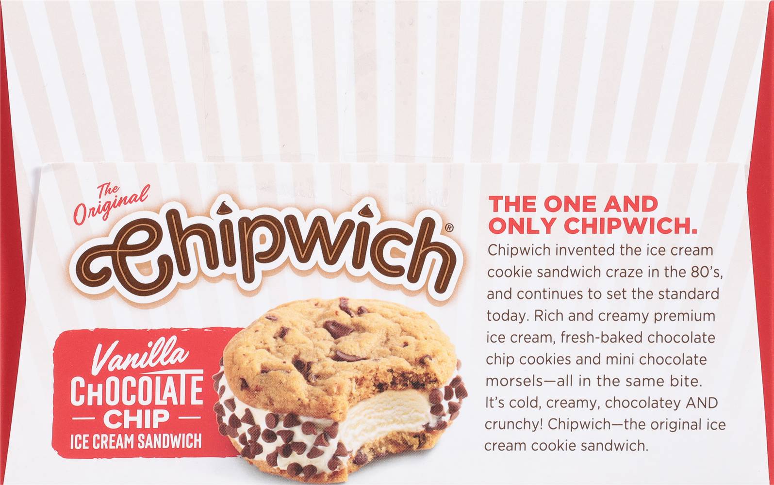 No artificial flavors or colors. The original. Real chocolate chips. Premium ice cream. Chipwich invented the ice cream cookie sandwich craze in the 80's, and continues to set the standard today. Rich and creamy premium ice cream, fresh-baked chocolate chip cookies and mini chocolate morsels - all in the same bite. It's cold, creamy, chocolatey and crunchy! • Flavor: Vanilla-chocolate chip • Pack size: 3 • Number of servings: 3