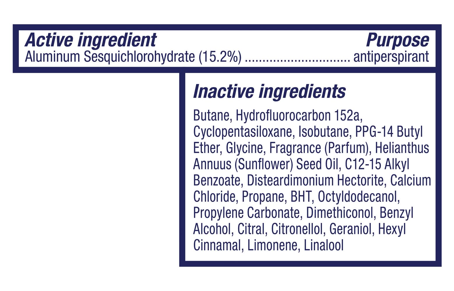 Ingredients: Active Ingredients: Aluminum Sesquichlorohydrate (15.2 %), Antiperspirant. Inactive Ingredients: Butane, Hydrofluorocarbon 152A, Cyclopentasiloxane, Isobutane, PPG-14 Buty Ether, Glycine, Fragrance (Parfum), Helianthus Annus (Sunflower) Seed Oil, C12-15 Alkyl Benzoate, Disteardimonium Hectorite, Calcium Chloride, Propane, BHT, Octyldodecanol, Propylene Carbonate, Dimethiconol, Benzyl Alcohol, Citral, Citronellol, Geraniol, Hexyl Cinnamal, Limonene, Linalool