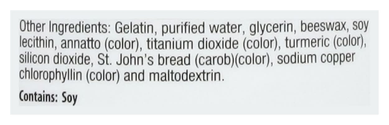 Ingredients: Other Ingredients: Gelatin, Purified Water, Glycerin, Beeswax, Soy Lecithin, Annatto (Color), Titanium Dioxide (Color), Turmeric (Color), Silicon Dioxide, St, John's Bread (Carob)(Color), Sodium Copper Chlorophyllin (Color) and Maltodextrin Contains: Soybeans