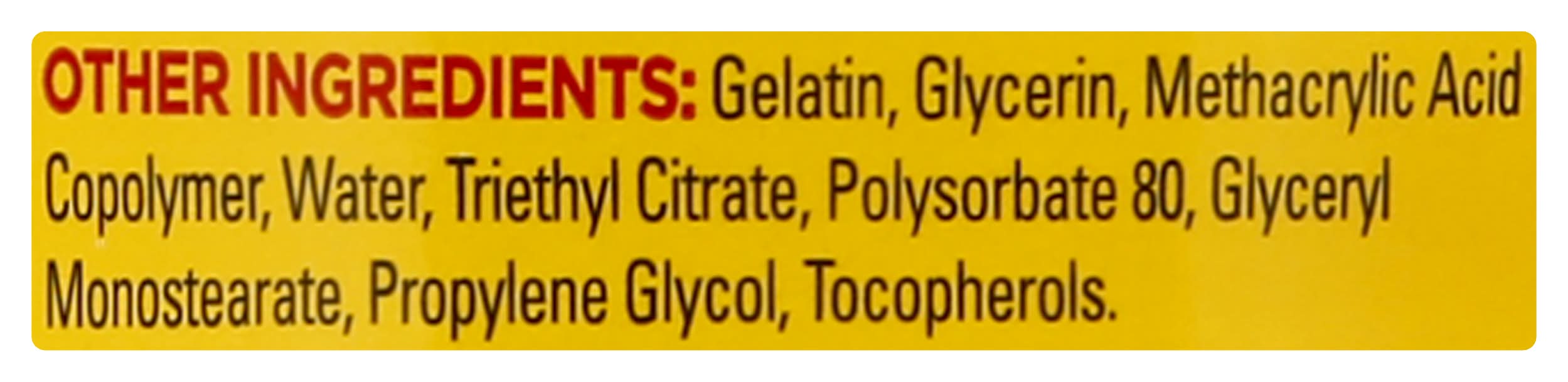 Ingredients: Fish Oil, Omega-3 EPA (Eicosapentaenoic Acid)††, Omega-3 DHA (Docosahexaenoic Acid), Omega-3 Other, Gelatin, Glycerin, Methacrylic Acid Copolymer, Water, Triethyl Citrate, Polysorbate 80, Glyceryl Monostearate, Propylene Glycol, Tocopherols. Contains: Anchovy, Sardines, Mackerel