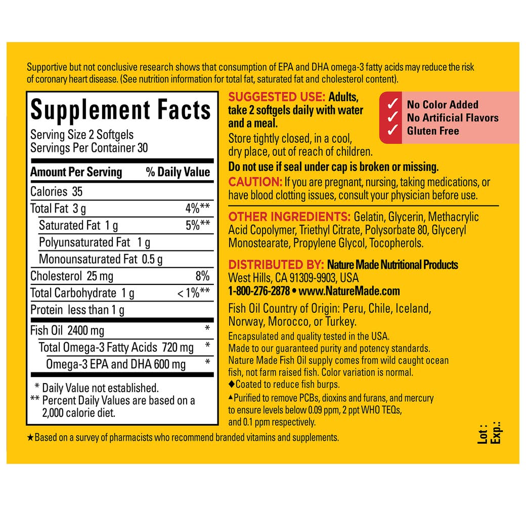 Nature Made Burp Less (3) Fish Oil 1200 mg is a dietary supplement that provides 360 mg Omega-3 fatty acids per softgel to help support a healthy heart. A serving of two Nature Made Fish Oil Omega 3 softgels provides 2400 mg Fish Oil with 720 mg Omega 3s (600 mg EPA and DHA). Sourced from high quality ingredients, these gluten free Nature Made Fish Oil 1200 mg softgels have no color added and no artificial flavors. Nature Made burp less fish oil supplements for women and men are purified to