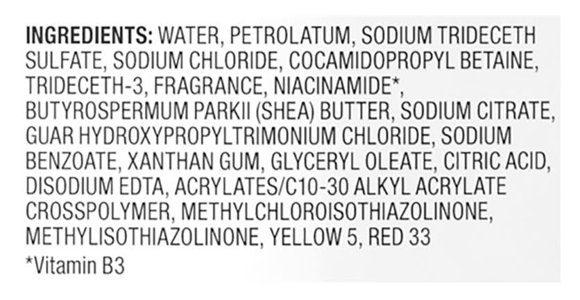 Ingredients: Water, Petrolatum, Sodium Trideceth Sulfate, Sodium Chloride, Cocamidopropyl Betaine, Trideceth-3, Fragrance, Niacinamide, Butyrospermum Parkii (Shea) Butter, Sodium Citrate, Guar Hydroxypropyltrimonium Chloride, Sodium Benzoate, Xanthan Gum, Glyceryl Oleate, Citric Acid, Disodium EDTA, Acrylates/C10-30 Alkyl Acrylate Crosspolymer, Methylchloroisothiazolinone, Methylisothiazolinone, Yellow 5, Red 33, *Vitamin B3 Contains: Tree Nuts