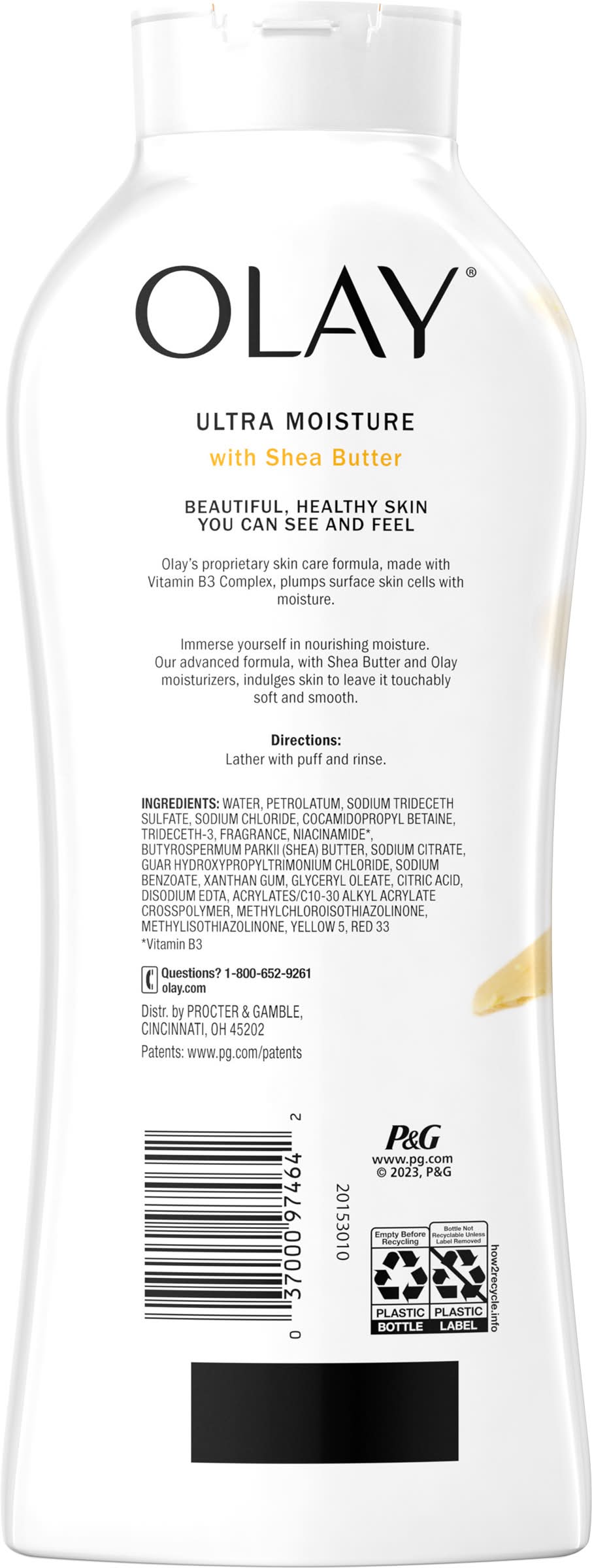 Visibly smooth skin in 14 days. Ultra moisture with shea butter. 24 Hr moisturizing body wash. Vit B3 complex. Beautiful, healthy skin you can see and feel. Olay's proprietary skin care formula, made with Vitamin B3 Complex, plumps surface skin cells with moisture. Immerse yourself in nourishing moisture. Our advanced formula, with Shea Butter and Olay moisturizers, indulges skin to leave it touchably soft and smooth. • Procter & Gamble, Cincinnati,OH,45202 • Packaging: Reusable