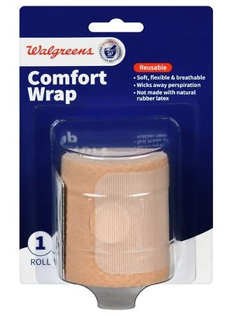 Walgreens Comfort Wrap Elastic Bandages Roll is designed for cushioned support with a soft, flexible, and breathable construction. Featuring a unique foam inner layer, this athletic bandage efficiently wicks away perspiration while allowing heat and moisture to escape, ensuring comfort during use. It applies effortlessly without adhering to skin or hair, and its washable, reusable nature offers continued utility. The bandage is hypoallergenic, as well as free from latex and neoprene, making it suitable for those with sensitivities. Walgreen Co, 200 Wilmort Rd, Deerfield, IL 6005