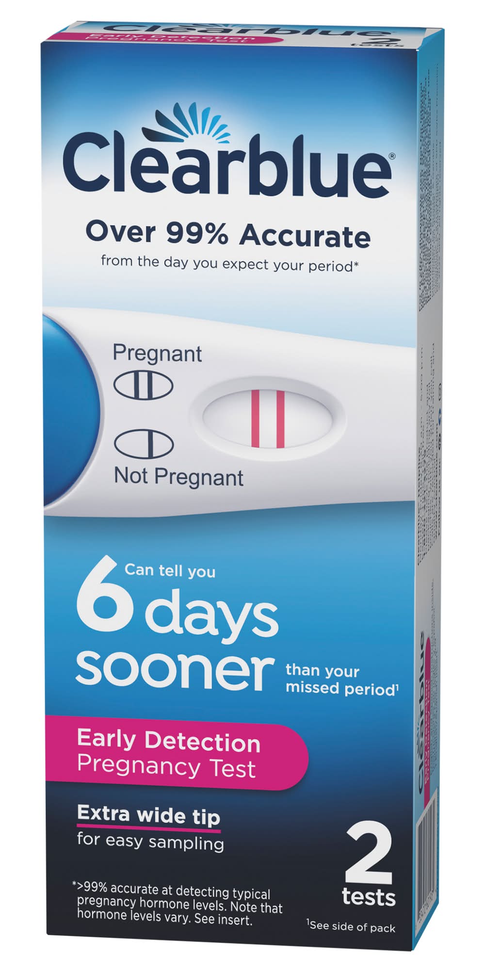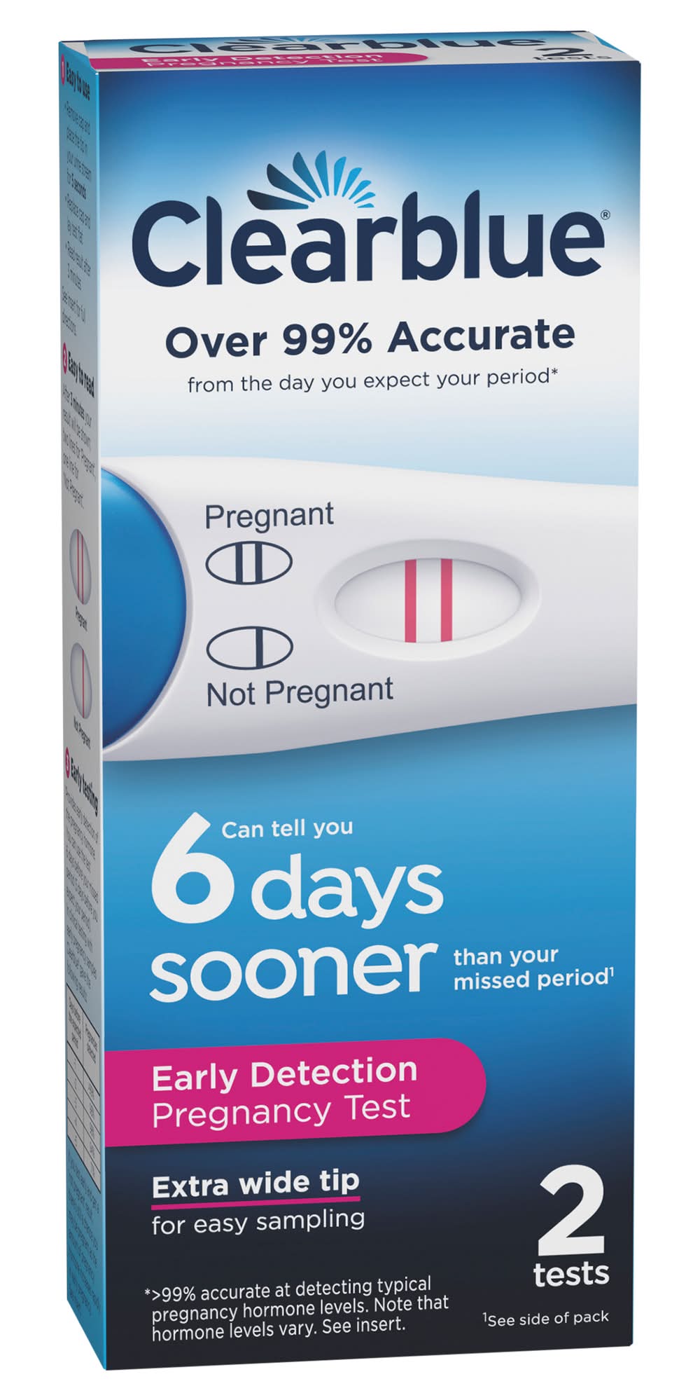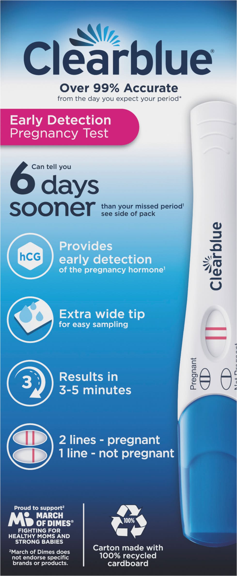 Contents: 2 test sticks and 1 English/Spanish insert. Over 99% accurate from the day you expect your period (Greater than 99% accurate at detecting typical pregnancy hormone levels. Note that hormone levels vary. See insert). Can tell you 6 days sooner than your missed period (Provides early detection of the pregnancy hormone. You can use the test 6 days before your missed period (5 days before you expect your period). In clinical testing with early pregnancy samples Clearblue gave the following results: Days before the expected period: -1; Pregnancies detected: greater than 99%. Days before the expected period: -2; Pregnancies detected: 98%. Days before the expected period: -3; Pregnancies detected: 98%. Days before the expected period: -4; Pregnancies detected: 94%. Days before the expected period: -5; Pregnancies detected: 71%). Extra wide tip for easy sampling. Provides early detection of the pregnancy hormone (Provides early detection of the pregnancy hormone. You can use the test 6 days before your missed period (5 days before you expect your period). In clinical testing with early pregnancy samples Clearblue gave the following results: Days before the expected period: -1; Pregnancies detected: greater than 99%. Days before the expected period: -2; Pregnancies detected: 98%. Days before the expected period: -3; Pregnancies detected: 98%. Days before the expected period: -4; Pregnancies detected: 94%. Days before the expected period: -5; Pregnancies detected: 71%). Results in 3 - 5 minutes. 2 lines - pregnant, 1 line - not pregnant. English and Spanish instructions inside. March if Dimes: Fighting for healthy moms and strong babies. Carton made with 100% recycled cardboard. Packaging: Reusable