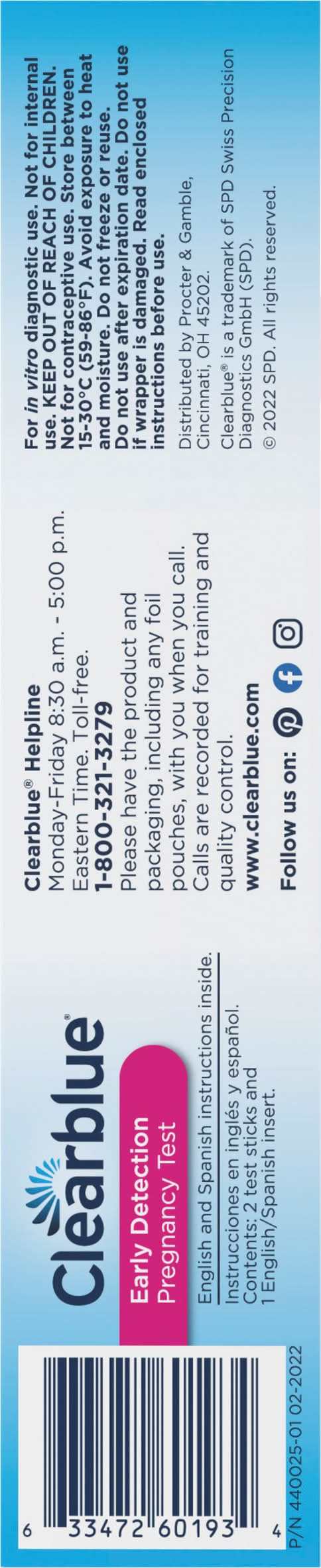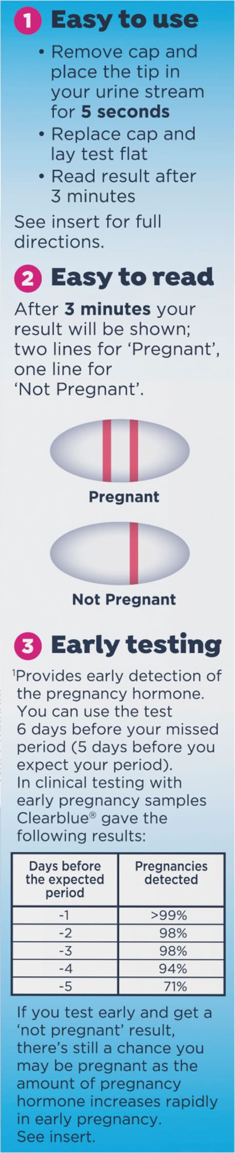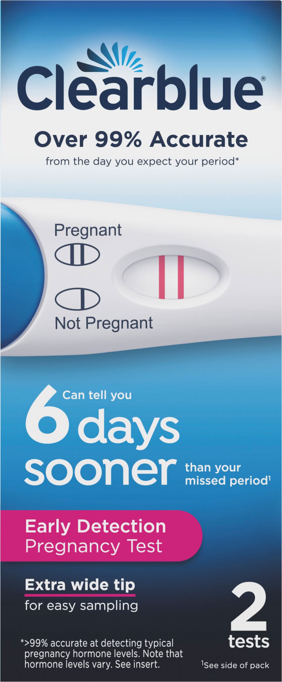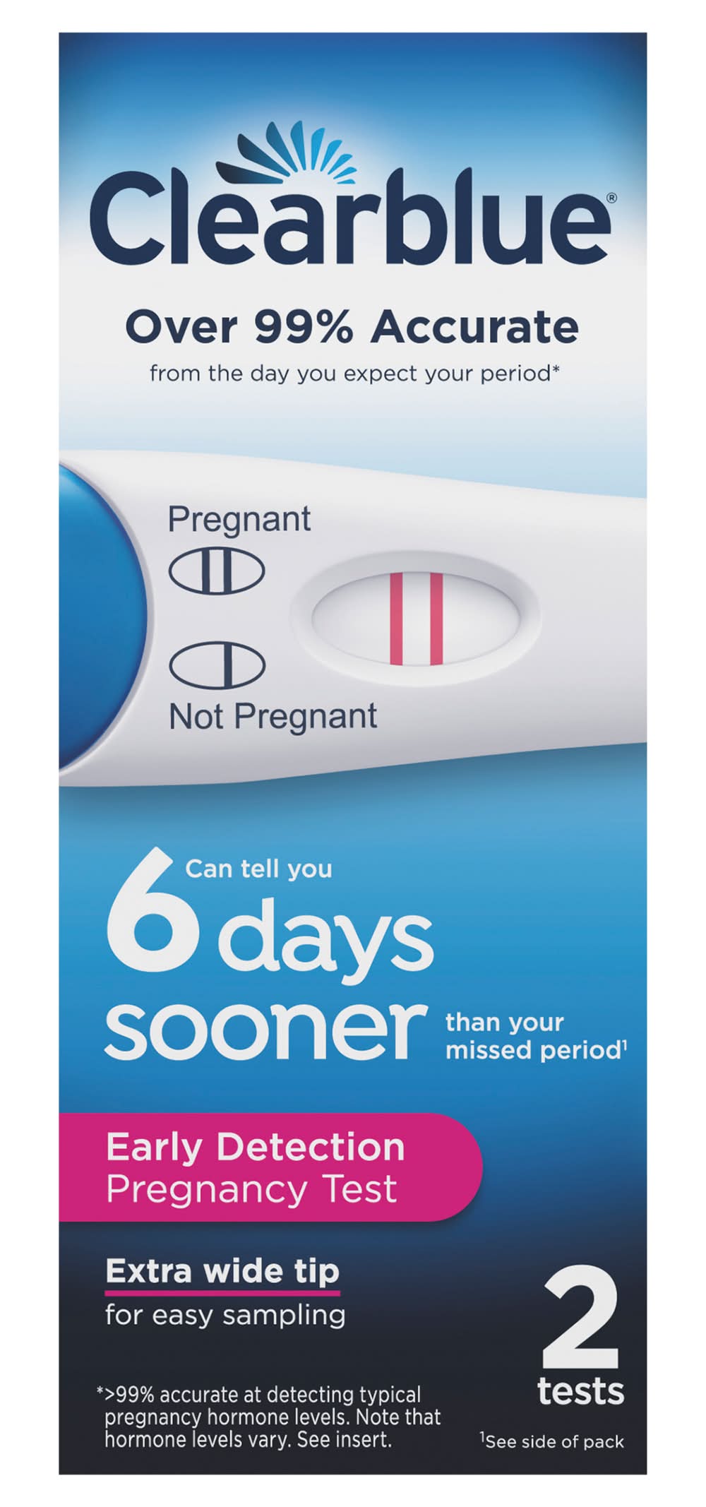Contents: 2 test sticks and 1 English/Spanish insert. Over 99% accurate from the day you expect your period (Greater than 99% accurate at detecting typical pregnancy hormone levels. Note that hormone levels vary. See insert). Can tell you 6 days sooner than your missed period (Provides early detection of the pregnancy hormone. You can use the test 6 days before your missed period (5 days before you expect your period). In clinical testing with early pregnancy samples Clearblue gave the following results: Days before the expected period: -1; Pregnancies detected: greater than 99%. Days before the expected period: -2; Pregnancies detected: 98%. Days before the expected period: -3; Pregnancies detected: 98%. Days before the expected period: -4; Pregnancies detected: 94%. Days before the expected period: -5; Pregnancies detected: 71%). Extra wide tip for easy sampling. Provides early detection of the pregnancy hormone (Provides early detection of the pregnancy hormone. You can use the test 6 days before your missed period (5 days before you expect your period). In clinical testing with early pregnancy samples Clearblue gave the following results: Days before the expected period: -1; Pregnancies detected: greater than 99%. Days before the expected period: -2; Pregnancies detected: 98%. Days before the expected period: -3; Pregnancies detected: 98%. Days before the expected period: -4; Pregnancies detected: 94%. Days before the expected period: -5; Pregnancies detected: 71%). Results in 3 - 5 minutes. 2 lines - pregnant, 1 line - not pregnant. English and Spanish instructions inside. March if Dimes: Fighting for healthy moms and strong babies. Carton made with 100% recycled cardboard. Packaging: Reusable
