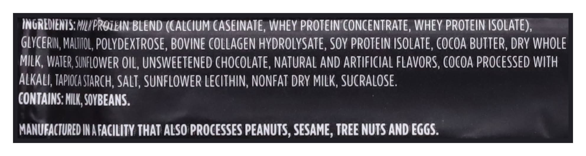 Ingredients: Milk Protein Blend (Calcium Caseinate, Whey Protein Concentrate, Whey Protein Isolate), Glycerin, Maltitol, Polydextrose, Bovine Collagen Hydrolysate, Soy Protein Isolate, Cocoa Butter, Dry Whole Milk, Water, Sunflower Oil, Unsweetened Chocolate, Natural and Artificial Flavors, Cocoa Processed with Alkali, Tapioca Starch, Salt, Sunflower Lecithin, Nonfat Dry Milk, Sucralose Contains: Milk, Soybeans, Peanuts, Sesame, Tree Nuts, Eggs