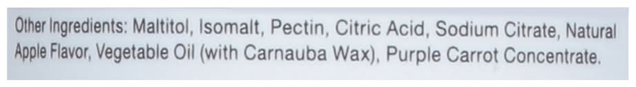 Ingredients: Maltitol, Isomalt, Pectin, Citric Acid, Sodium Citrate, Natural Apple Flavor, Vegetable Oil (with Carnauba Wax), Purple Carrot Concentrate