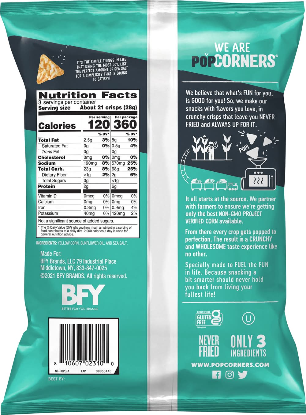 The crunchy and wholesome popped-corn snack. No artificial flavors colors or preservatives. 120 calories per serving. Certified gluten-free. gfco.org. Non GMO Project verified. nongmoproject.org. Never fried. It’s the simple things in life that bring the most joy. Like the perfect amount of sea salt for a simplicity that is bound to satisfy! We are Popcorners: We believe that what's fun for you, is good for you! So we make our snacks with flavors you love, in crunchy crisps that leave you never fried and always up for it. It all starts at the source. We partner with farmers to ensure we're getting only the best non-GMO project verified corn available. Specially made to fuel the fun in life. Because snacking a bit smarter should never hold you back from living your fullest life! • Flavor: Sea salt • Bfy Brands, LLC, 79 Industrial Place,Middletown,NY
