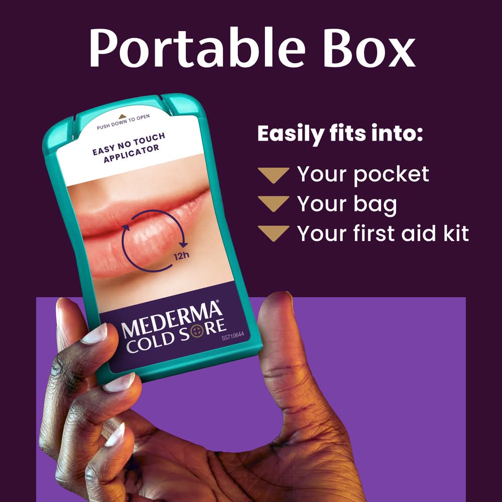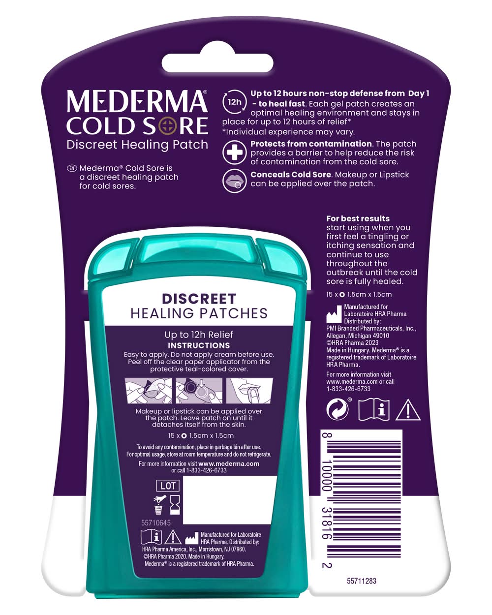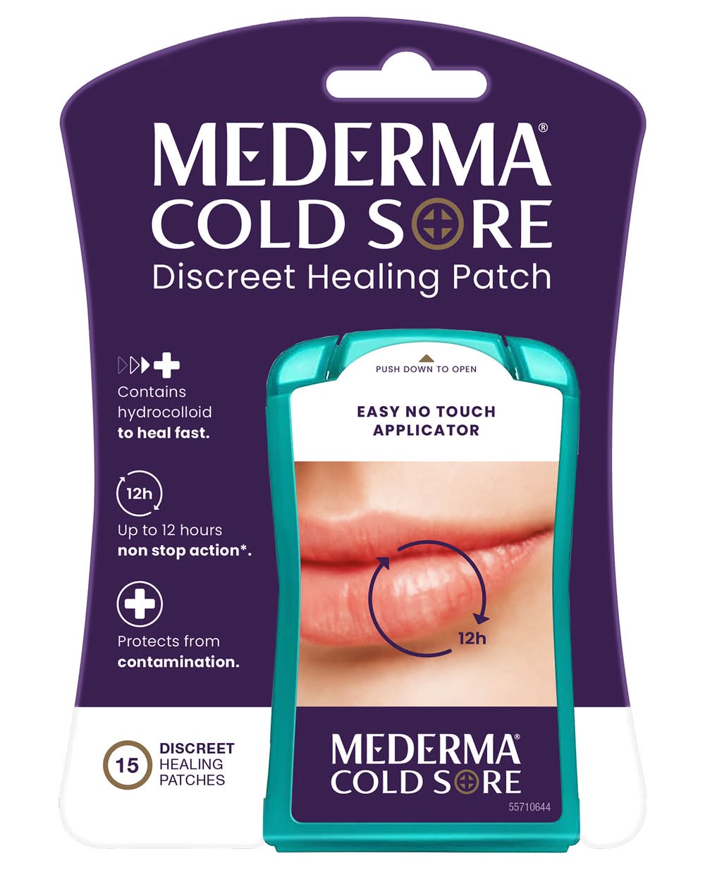 Mederma cold sore is a discreet patch for cold sores Up to 12 hours non-stop action from day 1 - to heal fast. Each active gel patch creates an optimal healing environment and stays in place for up to 12 hours of relief* *Individual experience may vary. In a clinical study involving 174 subjects 25% of the subjects had a wear time of 12 hours or more Protects from contamination. The patch provides a barrier to help reduce the risk of contamination from the cold sore. Conceals cold sore. Makeup or lipstick can be applied over the patch.