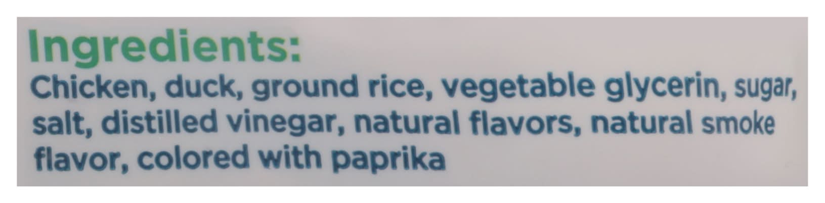 Ingredients: Chicken, Duck, Ground Rice, Vegetable Glycerin, Sugar, Salt, Distilled Vinegar, Natural Flavors, Natural Smoke Flavor, Colored with Paprika