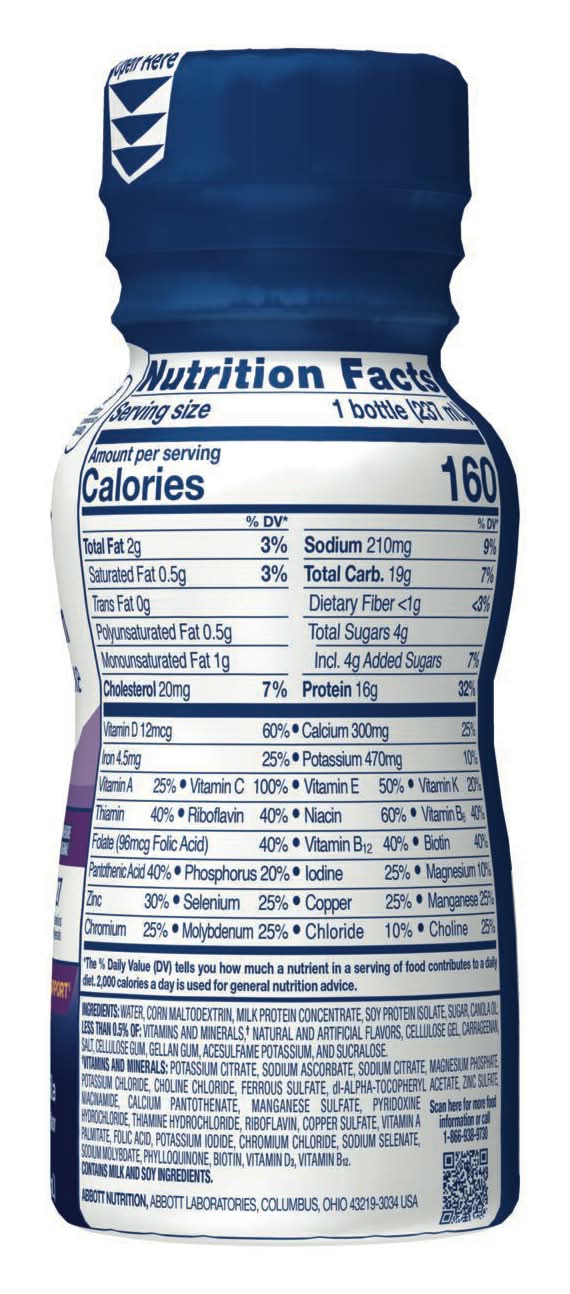 Ingredients: Water, Corn Maltodextrin, Sugar, Milk Protein Concentrate, Blend of Vegetable Oils (Canola, Corn), Soy Protein Isolate, Nonfat Milk. Less than 0.5% of: VITAMINS MINERALS (Potassium Citrate, Magnesium Phosphate, Calcium Carbonate, Sodium Citrate, Ascorbic Acid, Choline Chloride, Calcium Phosphate, Potassium Chloride, Potassium Hydroxide, Ferrous Sulfate, dl-Alpha-Tocopheryl Acetate, Zinc Sulfate, Niacinamide, Calcium Pantothenate, Magnesium Sulfate, Pyridoxine Hydrochloride, Thiamine Hydrochloride, Copper Sulfate, Riboflavin, Vitamin A Palmitate, Folic Acid, Potassium Iodide, Chromium Chloride, Sodium Selenate, Sodium Molybdate, Phylloquinone, Biotin, Vitamin D3, Vitamin B12), Natural Artificial Flavors, Cellulose Gel, Salt, Cellulose Gum, Monoglycerides, Soy Lecithin, Carrageenan, and Sucralose. Contains: Soybeans, Corn, Milk