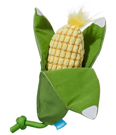 Grab the bull by the corns. It's time to play tug! This corn on the cob dog toy is stuffed with crazy crinkle and squeaks, and the sturdy nylon rope makes for fun fetching and fussing. Pups will also love the whippable husks which are a-maizing for thrashing! Size: M