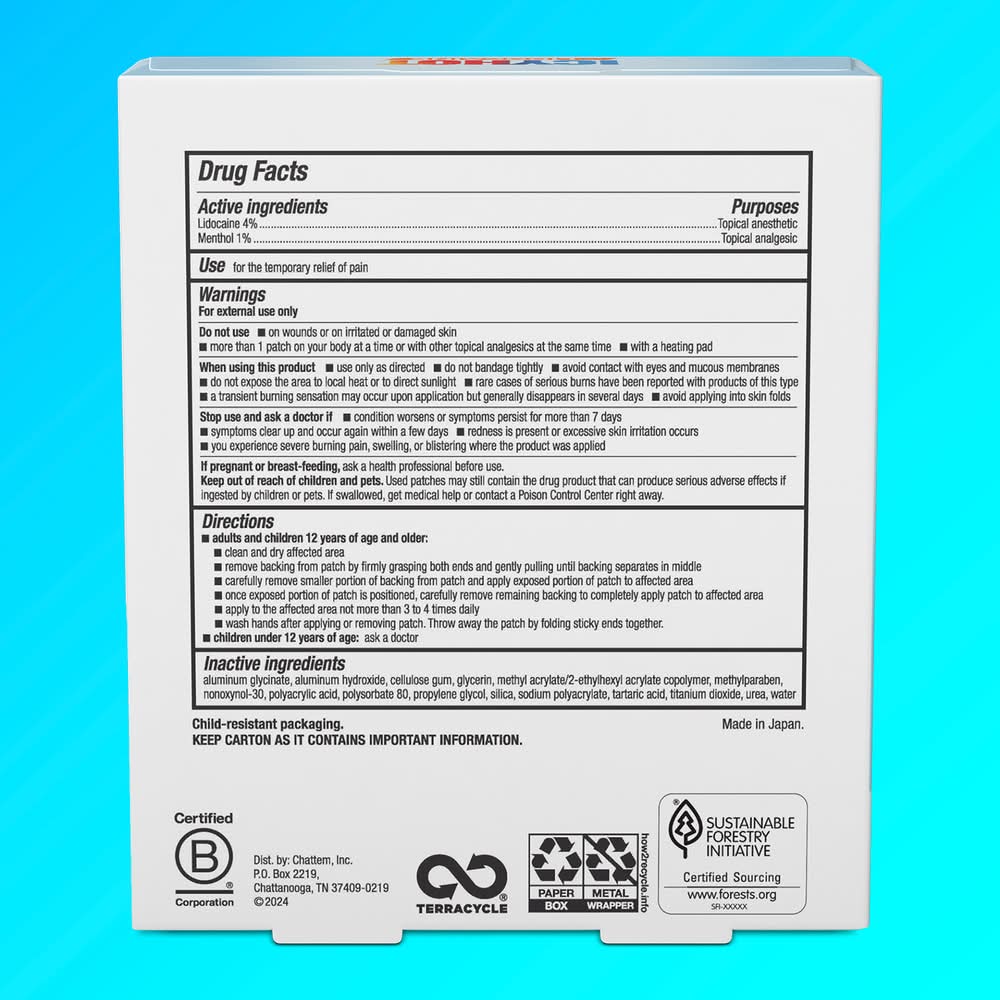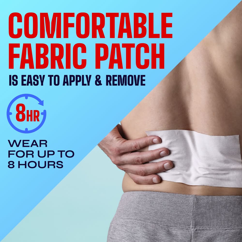Icy Hot Max Lidocaine Pain Relief Patches are designed to provide targeted and temporary relief of pain. Each patch contains lidocaine, a known anesthetic, to help numb the affected area. The product includes five patches, offering multiple applications for pain management. These patches are intended for external use only and can be applied directly to the skin where the pain is localized. These are large patches. • Size: 10x14 cm • Packaging: Reusable
