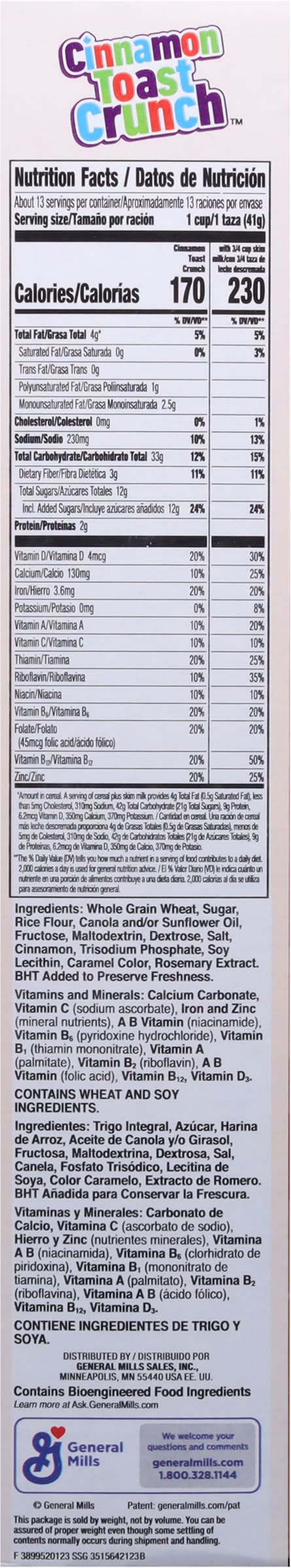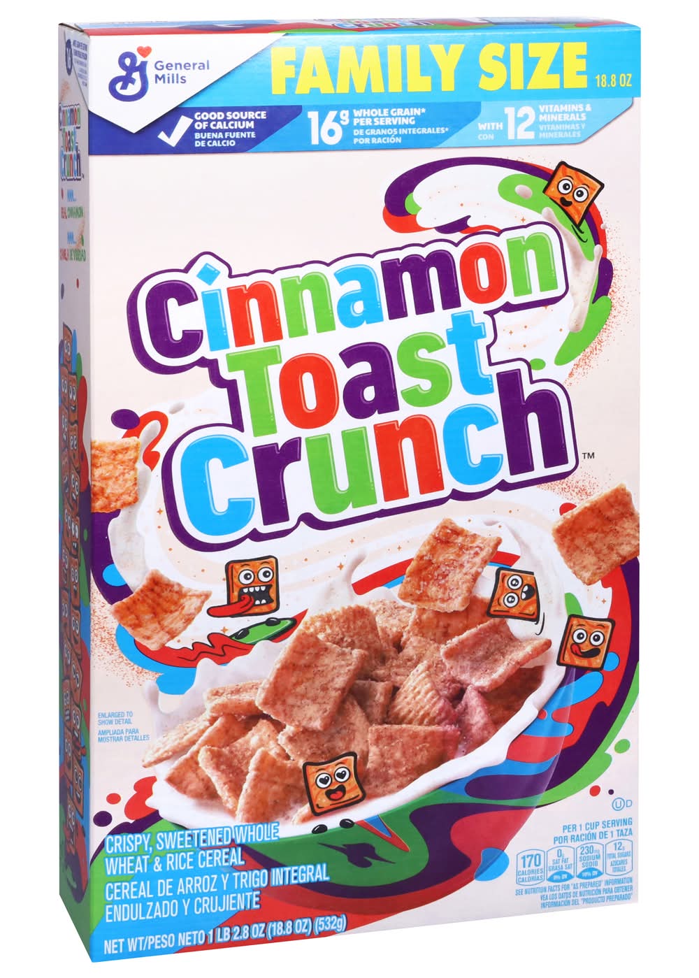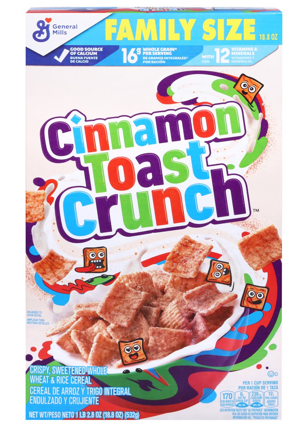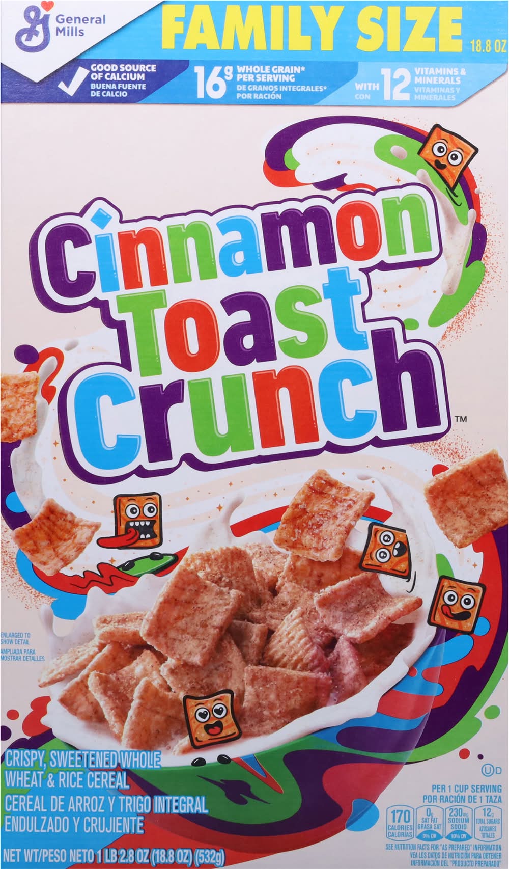 Get off to an epic start with Cinnamon Toast Crunch Cereal. Every crispy square is blasted with CINNADUST, that irresistible mix of real cinnamon and sugar. Enjoy this crispy, sweetened whole wheat and rice cereal as a ready to eat breakfast food. Simply pour a bowl of cold cereal with milk and dig into that satisfying crunch. Then slurp up the CINNAMILK, the sweet and awesomely tasty cereal milk at the bottom of your bowl. , 12 vitamins and minerals, and a good source of calcium. Make it a part of a quick and easy breakfast for teens, kids, and the entire family. Pack some in snack bags and enjoy this crispy cereal on the go. Add it to snack mix or cereal bars recipes for lunchbox snacks. Keep a box in your pantry for mornings or to use as a crispy ice cream topping. You can also sprinkle some cinnamon-y squares over frosted cupcakes and other desserts. Whether you're looking for delicious kids snacks, trail mix ingredients, or a breakfast cereal for everyone in your household, General Mills cereals spread goodness from tots to grown-ups. Crispy Cinnamon Cereal, Family Size, Perfect for instant snacking, or a part of breakfast and meals. • General mills sales, inc., Minneapolis,MN,55440 • Packaging: Reusable