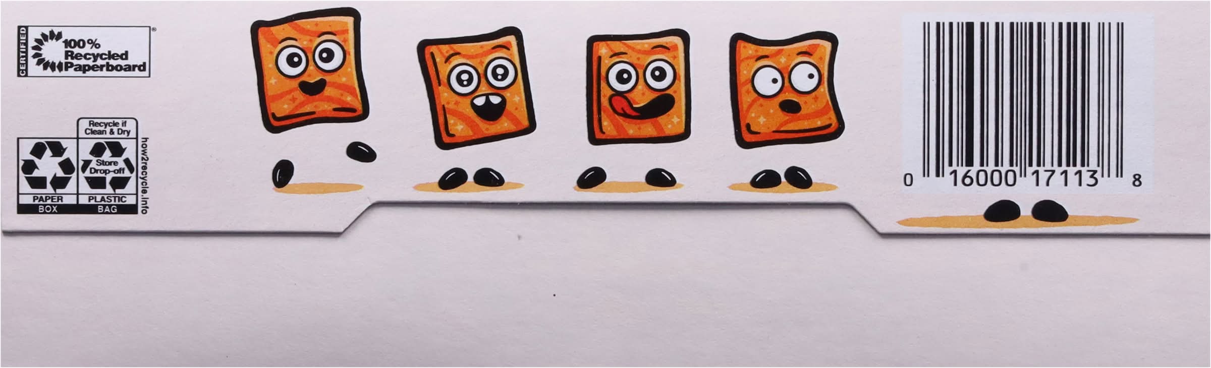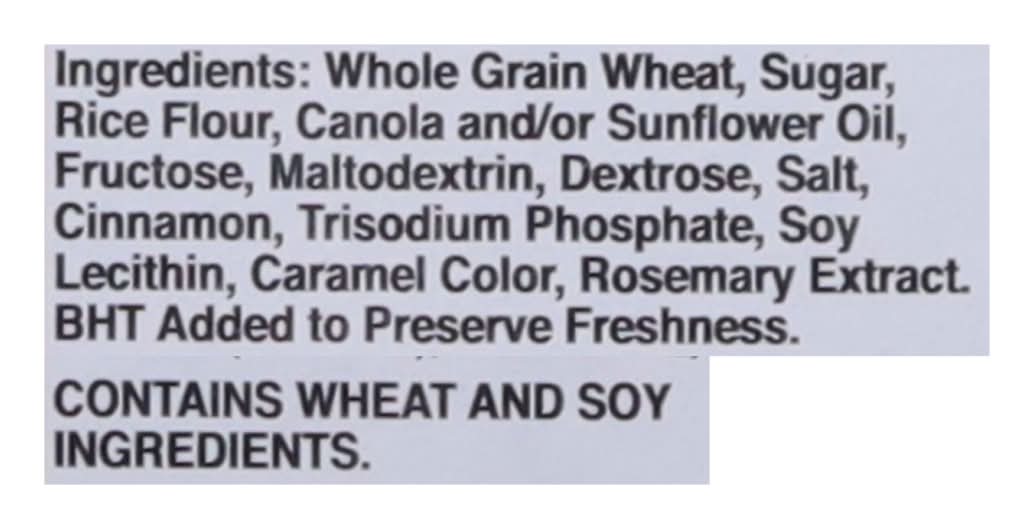 Ingredients: Whole Grain Wheat, Sugar, Rice Flour, Canola and/or Sunflower Oil, Fructose, Maltodextrin, Dextrose, Salt, Cinnamon, Trisodium Phosphate, Soy Lecithin, Caramel Color, Rosemary Extract, BHT Added to Preserve Freshness. Vitamins and Minerals: Calcium Carbonate, Vitamin C (Sodium Ascorbate), Iron and Zinc (Mineral Nutrients), A B Vitamin (Niacinamide), Vitamin B6 (Pyridoxine Hydrochloride), Vitamin B1 (Thiamin Mononitrate), Vitamin A (Palmitate), Vitamin B2 (Riboflavin), A B Vitamin (Folic Acid), Vitamin B12, Vitamin D3 Contains: Wheat, Soybeans