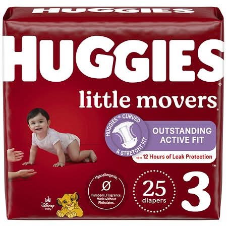 Huggies Little Movers Diapers for Active Babies Size 3 (25 Ct) • Size: 3 • Kimberly-Clark Global Sales, LLC, Neenah, WI, 54956 • Packaging: Reusable