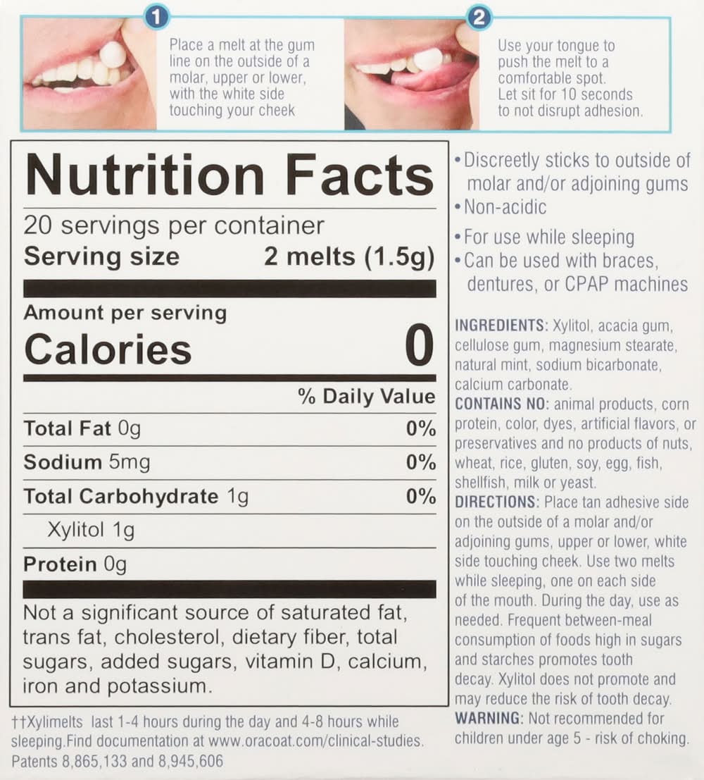 Sugar free with xylitol. Stick-on melts for moisturizing. Freshens breath. Provent to reduce morning dry mouth. Easy to use on-the-go. Last for hours (OralCoat oral adhering discs last 1-4 hours during the day and 4-8 hours while sleeping) sticks and stays on gum to coat, moisturize, and lubricate for long-lasting relief. Discreetly sticks to outside of molar and/or adjoining gums. Non-acidic. For use while sleeping. Can be used with braces, dentures or CPAP machines. No alcohol. Reduces plaque/tooth decay. All natural (All ingredients in XyliMelts exist in nature. No synthetic, artificial, coloring, or preservative ingredients are included. Xylitol is in many plants and animals. The xylitol in XyliMelts is made by conversion of wood sugar [xylose]). Allergen free. Contains No: Animal products, corn protein, color, dyes, artificial colors, or preservatives and no products of nuts, wheat, rice, gluten, soy, egg, fish, shellfish, milk or yeast. oracoat.com. (These statements have not been evaluated by the Food and Drug Administration. This product is not Intended to diagnose, treat, cure, or prevent any disease.) Made in USA.