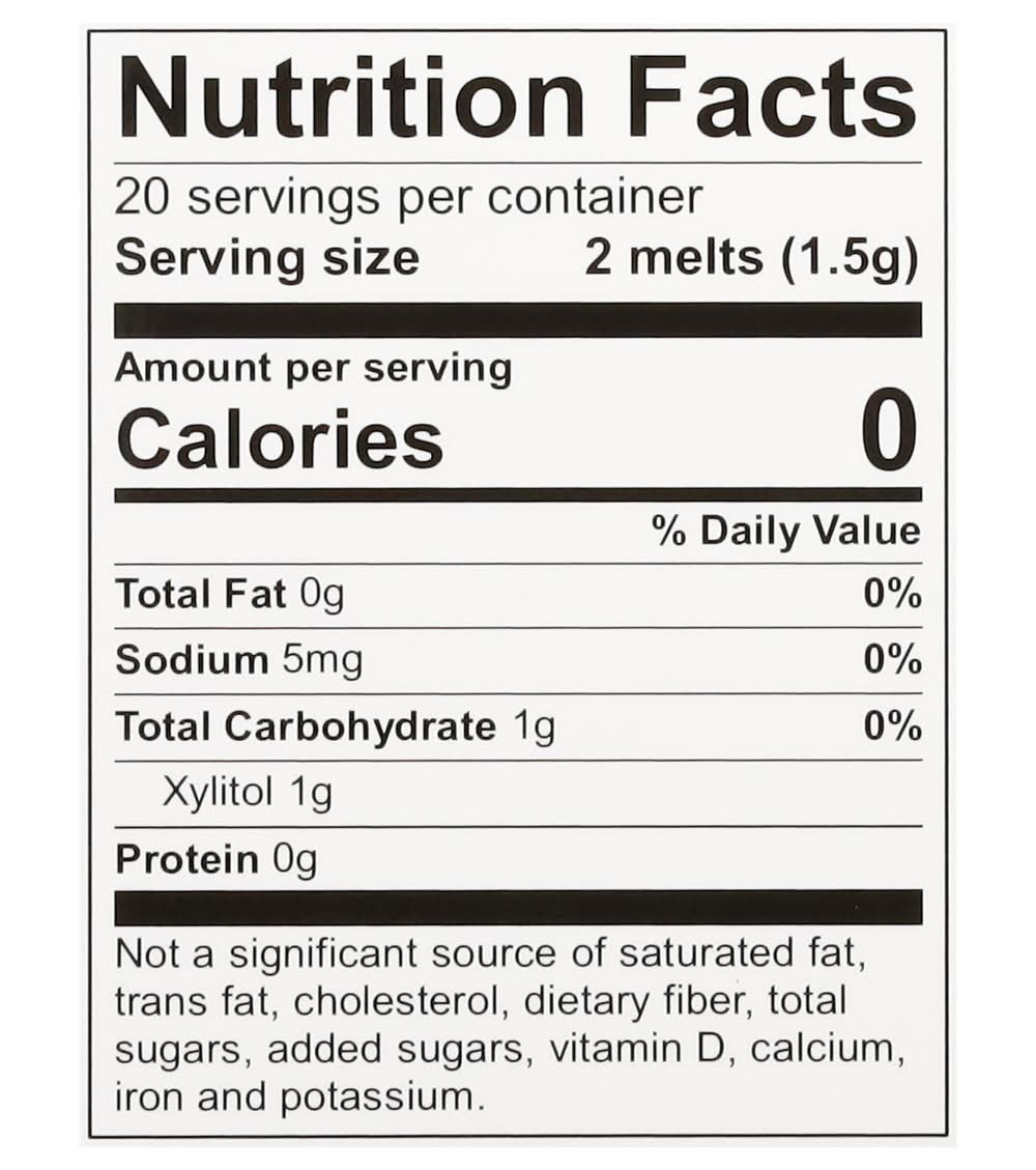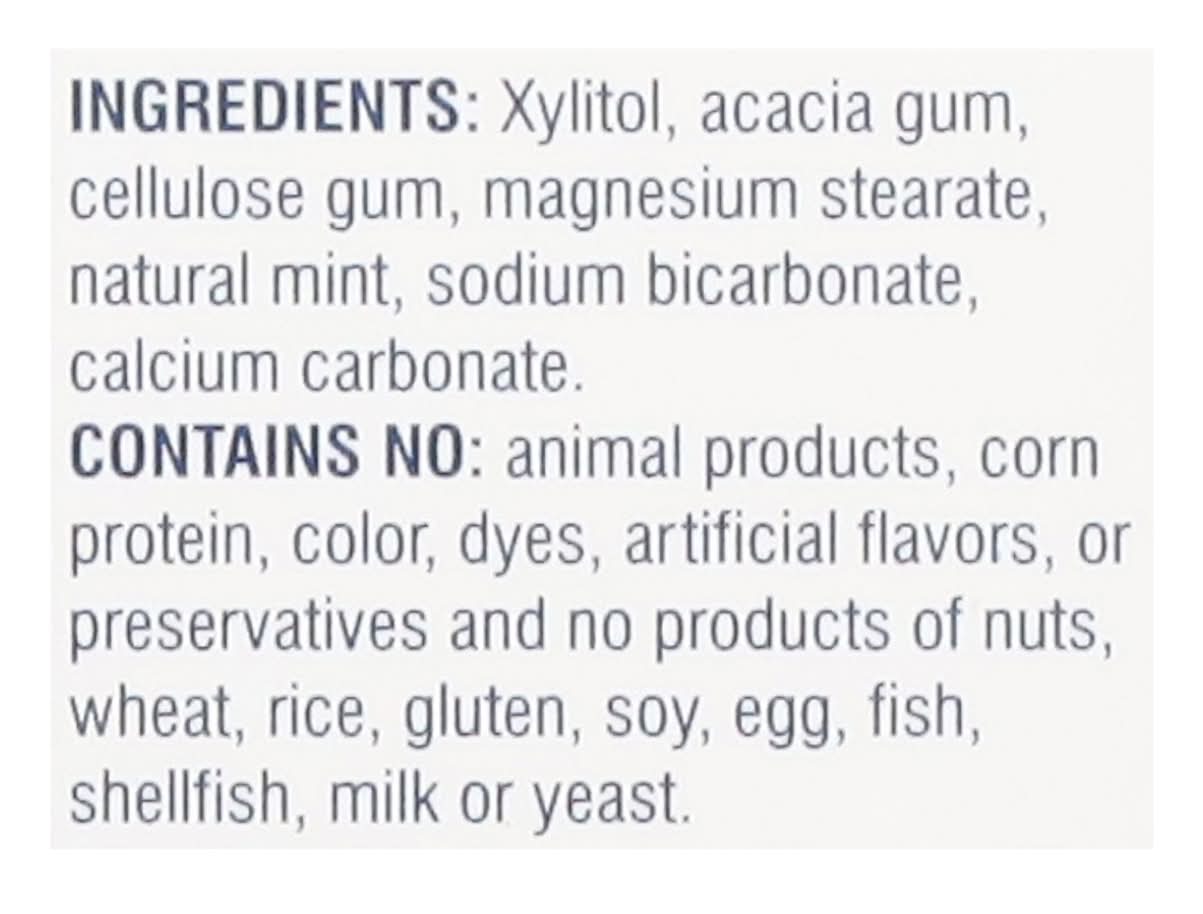 Ingredients: Xylitol, Acacia Gum, Cellulose Gum, Magnesium Stearate, Natural Mint, Sodium Bicarbonate, Calcium Carbonate