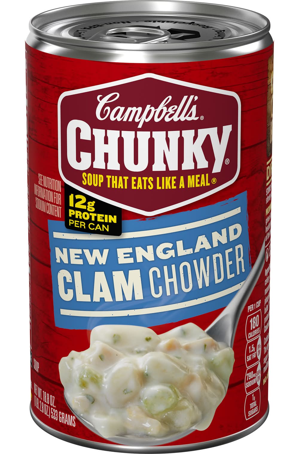 Campbell's Chunky New England Clam Chowder isn't just about taste. This rich, flavorful and hearty soup showcases the authenticity of its East Coast recipe in every bite. A classic comfort food, this delicious soup is crafted with generous pieces of succulent clam and hearty potatoes. Each can has 12 grams of protein (1). It Fills You Up Right. Just pop this soup into a saucepan or microwave-safe bowl, heat and enjoy. Or, heat it over the campfire on your outdoor adventures. Kick up it up a Packaging: Reusable