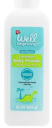 Well Beginnings Cornstarch Baby Powder is formulated with aloe vera and vitamin E, offering a gentle touch to a baby's skin. It is dermatologist tested and free from talc, parabens, and phthalates. The product is manufactured in India. Packaging: Reusable