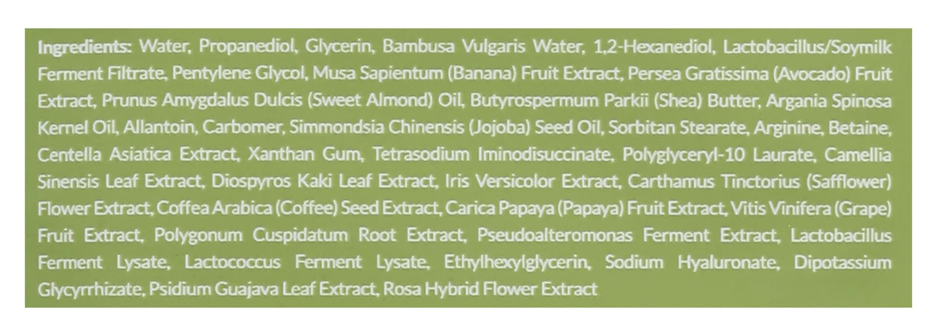 Ingredients: Water, Propanediol, Glycerin, Bambusa Vulgaris Water, 1.2-Hexanediol, Lactobacillus/Soymilk Ferment Filtrate, Pentylene Glycol, Musa Sapientum (Banana) Fruit Extract, Persea Gratissima (Avocado) Fruit Extract, Prunus Amygdalus Dulcis (Sweet Almond) Oil, Butyrospermum Parkii (Shea) Butter, Argania Spinosa Kernel Oil, Allantoin, Carbomer, Simmondsia Chinensis (Jojoba) Seed Oil, Sorbitan Stearate, Arginine, Betaine, Centella Asiatica Extract, Xanthan Gum, Tetrasodium Iminodisccinate, Polyglyceryl-10 Laurate, Camellia Sinensis Leaf Extract, Diospyros Kaki Leaf Extract, Iris Versicolor Extract, Carthamus Tinctorius (Safflower) Flower Extract, Coffea Arabica (Coffee) Seed Extract, Carica Papaya (Papaya) Fruit Extract, Vitis Vinifera (Grape) Fruit Extract, Polygonum Cuspidatum Root Extract, Pseudoalteromonas Ferment Extract, Lactobacillus Ferment Lysate, Lactococcus Ferment Lysate, Ethylhexylglycerin, Sodium Hyaluronate, Dipotassium Glycyrrhizate, Psidium Guajava Leaf Extract, Rosa Hybrid Flower Extract Contains: Soybeans, Tree Nuts, Almonds, Tree Nuts, Sheanuts, Tree Nuts, Argan Nuts