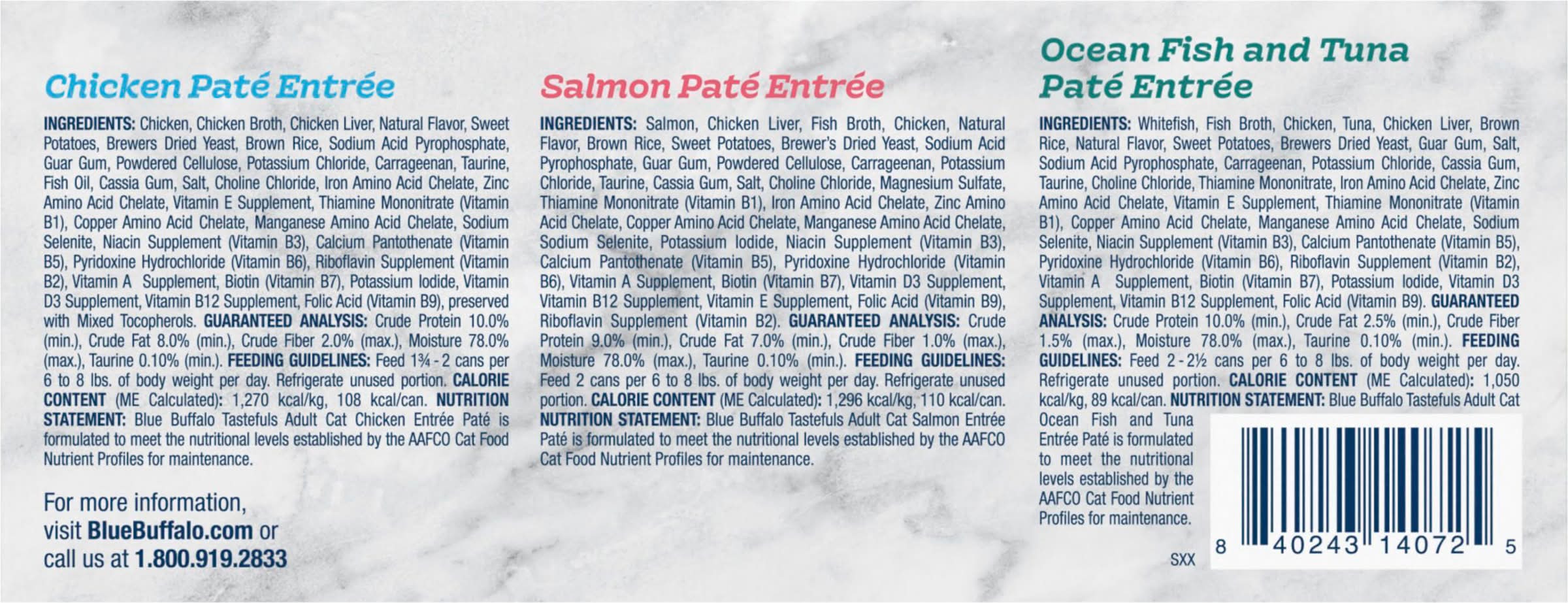 Natural food for adult cats enhanced with added vitamins, minerals and other nutrients. Chicken Entrees, Salmon Entrees, Ocean Fish and Tuna Entrees. No artificial flavors or preservatives. True Blue Promise: Real chicken or fish first ingredient. No chicken (or Poultry) By-Product meals. No corn, wheat or soy. No corn, wheat or soy. 4 chicken entree pate. 4 salmon entree pate. 4 ocean fish and tuna entree pate. • Pack size: 12 • Size: Adult • Blue Buffalo Company, 11 River Road,Wilton,CT,06897,USA