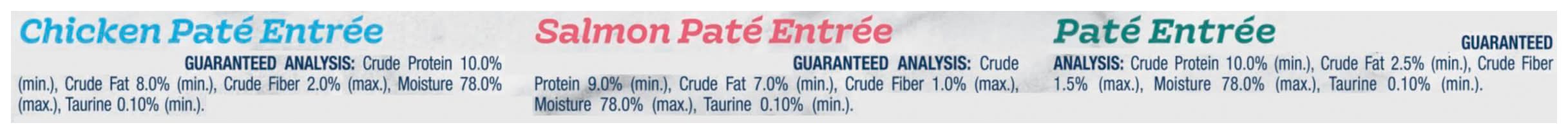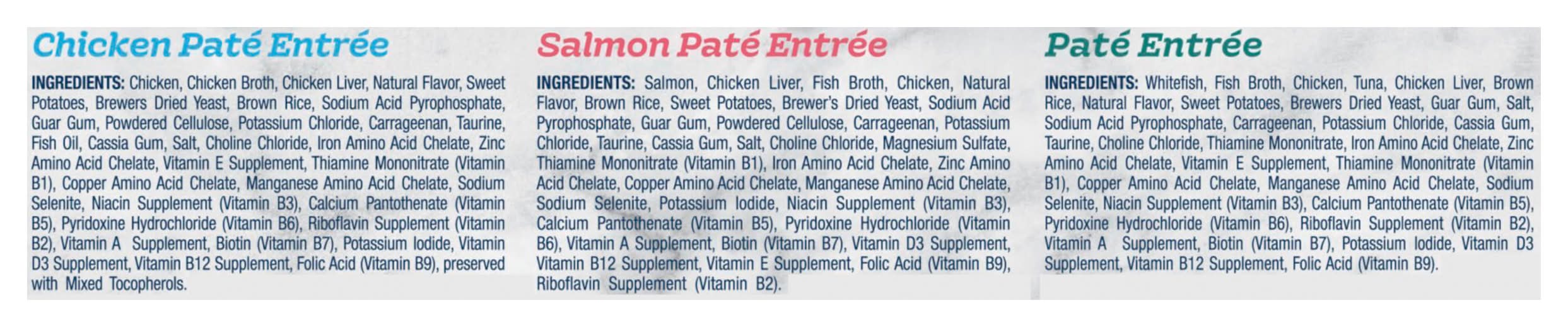 Ingredients: Chicken Entree Pate: Chicken, Chicken Broth, Chicken Liver, Natural Flavor, Brown Rice, Guar Gum, Sweet Potatoes, Powdered Cellulose, Tricalcium Phosphate, Sodium Acid Pyrophosphate, Carrageenan, Taurine, Fish Oil, Cassia Gum, Potassium Chloride, Salt, Choline Chloride, Iron Amino Acid Chelate, Zinc Amino Acid Chelate, Vitamin E Supplement, Thiamine Mononitrate Vitamin B1, Copper Amino Acid Chelate, Manganese Amino Acid Chelate, Sodium Selenite, Niacin Supplement Vitamin B3, Calcium Pantothenate Vitamin B5, Pyridoxine Hydrochloride Vitamin B6, Riboflavin Supplement Vitamin B2, Vitamin A Supplement, Biotin Vitamin B7, Potassium Iodide, Vitamin D3 Supplement Vitamin B12 Supplement, Folic Add Vitamin B9, Preserved with Mixed Tocopherols. Salmon Entree Pate: Salmon, Fish Broth, Chicken Liver, Chicken, Brown Rice, Natural Flavor, Guar Gum, Powdered Cellulose, Sweet Potatoes, Sodium Acid Pyrophosphate, Carrageenan, Taurine, Potassium Chloride, Cassia Gum, Salt, Choline Chloride, Magnesium Sulfate, Iron Amino Acid Chelate, Zinc Amino Acid Chelate, Vitamin E Supplement, Thiamine Mononitrate Vitamin B1, Copper Amino Acid Chelate, Manganese Amino Acid Chelate, Sodium Selenite, Niacin Supplement Vitamin B3, Calcium Pantothenate Vitamin B5, Pyridoxine Hydrochloride Vitamin B6, Riboflavin Supplement Vitamin B2, Vitamin A Supplement, Biotin Vitamin B7, Potassium Iodide, Vitamin D3 Supplement, Vitamin B12 Supplement, Folic Acid Vitamin B9. Ocean Fish and Tuna Entree Pate: Whitefish, Fish Broth, Tuna, Chicken, Chicken Liver, Brown Rice, Natural Flavor, Guar Gum, Sweet Potatoes, Potassium Chloride, Salt, Sodium Acid Pyrophosphate, Carrageenan, Cassia Gum, Taurine, Choline Chloride, Iron Amino Acid Chelate, Zinc Amino Acid Chelate, Vitamin E Supplement, Thiamine Mononitrate Vitamin B1, Copper Amino Acid Chelate, Manganese Amino Acid Chelate, Sodium Selenite, Niacin Supplement Vitamin B3, Calcium Pantothenate Vitamin B5, Pyridoxine Hydrochloride Vitamin B6, Riboflavin Supplement Vitamin B2, Vitamin A Supplement, Biotin Vitamin B7, Potassium Iodide, Vitamin D3 Supplement, Vitamin B12 Supplement, Folic Acid Vitamin B9. Contains: Fish, Fish, Salmon, Fish, Tuna