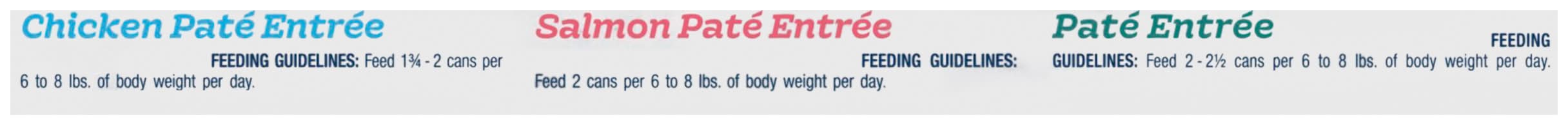Directions for use: Chicken Entree Pate: Feeding Guidelines: Feed 2 cans per 6 to 8 lbs. of body weight per day. Refrigerate unused portion. Salmon Entree Pate: Feeding Guidelines: Feed 2 cans per 6 to 8 lbs. of body weight per day. Refrigerate unused portion. Ocean Fish and Tuna Entree Pate: Feeding Guidelines: Feed 2 cans per 6 to 8 lbs. of body weight per day. Refrigerate unused portion. Storage recommendation: Refrigerate unused portion.