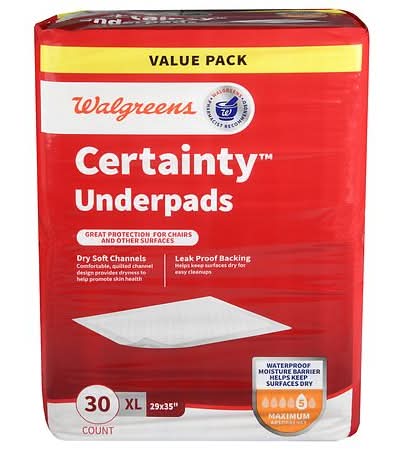Walgreens Certainty Underpads Waterproof Maximum Absorbency Pads, XL (30 ct)