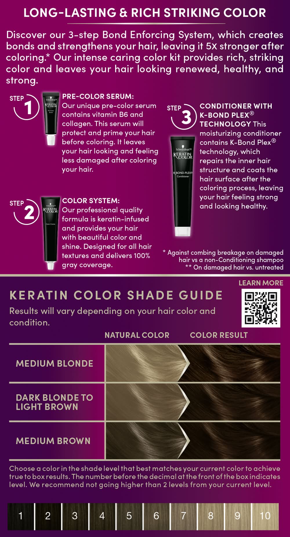 Step 1: before: protective pre-color serum conditions the hair before coloring for a more even color result from root to tip. step 2: during: color cream with keratin-complex offers long-lasting color & 100% gray coverage. step 3: after: k-bond-plex conditioner repairs inner hair structure and coats the hair surface after the coloration process for strong and healthy looking hair. keratin color shade guide: results will vary depending on your color and condition. current color: medium blonde; dark blonde to light brown; medium brown. color result. chose a color in the shade level that best matches your current color to achieve true to box results. the number before the decimal at the front of the box indicates level. we recommend not going higher than 2 levels from your current level. contents: 1 applicator bottle with developer lotion 2 fl oz/60 ml. 1 tube color cream 2 fl oz/60 ml. 1 tube k-bond-plex conditioner 1.7 fl oz/50 ml. 1 tube pre-color serum 0.4 fl oz/12 ml. 1 instruction leaflet-please read carefully. 1 pair of gloves.