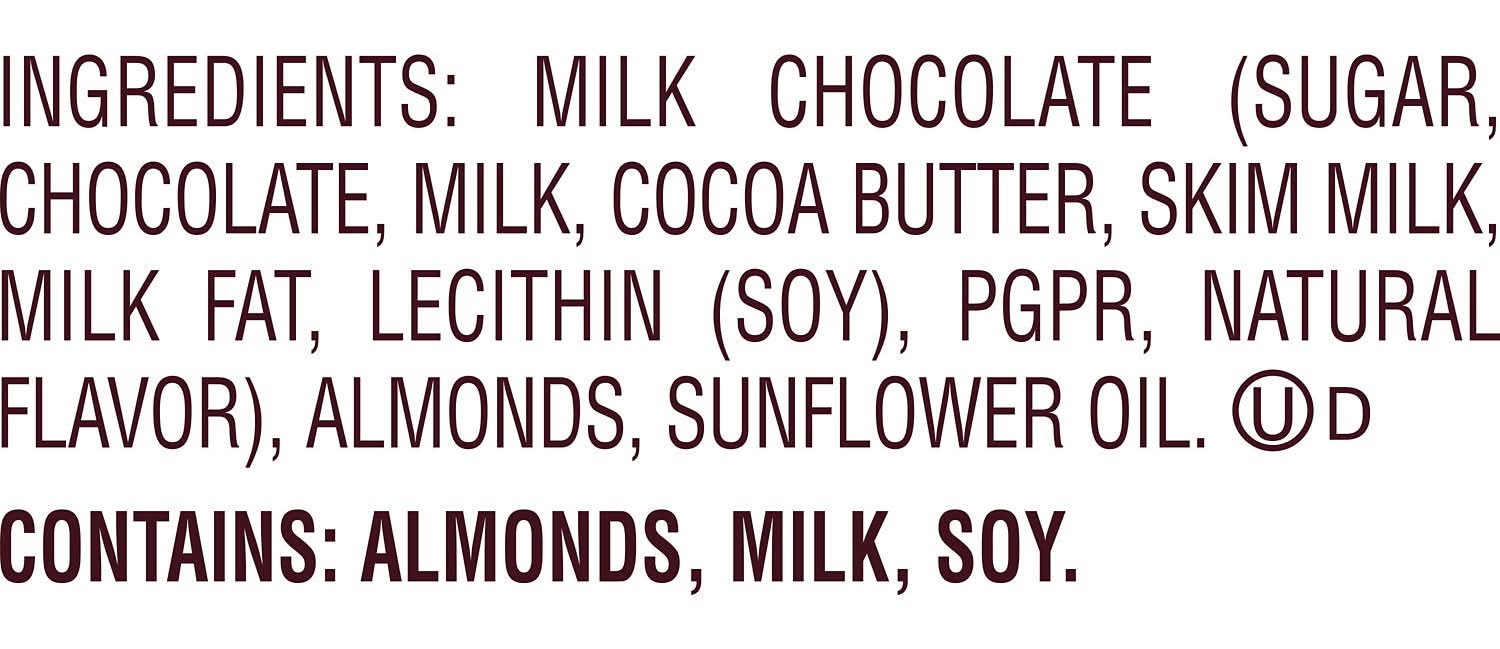 Ingredients: MILK CHOCOLATE, SUGAR, CHOCOLATE, MILK, COCOA BUTTER, SKIM MILK, MILK FAT, LECITHIN (SOY), PGPR, NATURAL FLAVOR, ALMONDS, SUNFLOWER OIL. Contains: Contains: Almonds|Soy|Milk