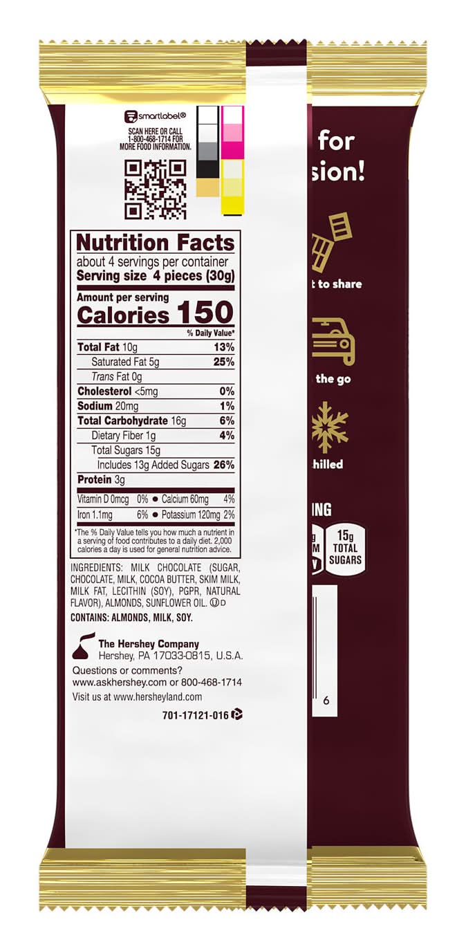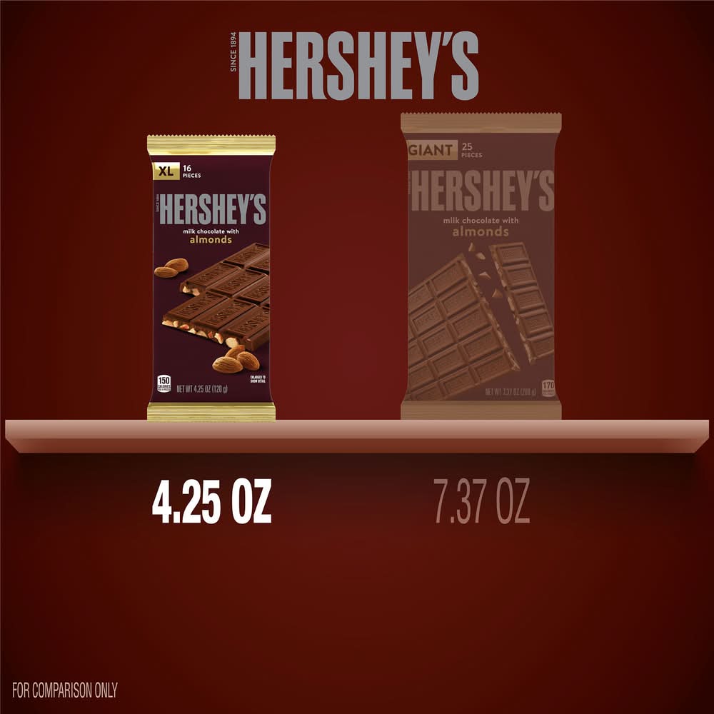 Made from deliciously creamy milk chocolate and crunchy almonds, these extra large candy bars are an elevated take on a classic that's been enjoyed for decades. Whether you enjoy this extra large milk chocolate bar alone or shared with loved ones, you can count on this sweet to put a smile on any face. This larger than life candy bar is the perfect treat for countless special and everyday occasions. HERSHEY'S XL almond and milk chocolate bars are sure to put a smile on the face of everyone you share them with. Remember to save a few XL candy bars for guests, and store a few in your pantry for convenient snacking whenever the mood strikes. Show up to movie night with XL bars of HERSHEY'S milk chocolate to please the whole crowd and become the reigning champion of the night's snack selection. Or you can gather around the campfire with friends and family to make s'mores! Revamp your favorite homemade recipes by using this sweet treat on top of freshly baked cakes, cookies and cupcakes. Use these bars to stuff Christmas stockings, Halloween trick-or-treat bags, Easter baskets and Valentine's Day party favors. Or, include broken up pieces of this XL bar in your ice cream sundae topping selection. Everyone is excited when they're reaching for HERSHEY'S XL milk chocolate almond bars, and now you can be too. • Size: XL • The Hershey Company, Hershey,PA,17033-0815,USA