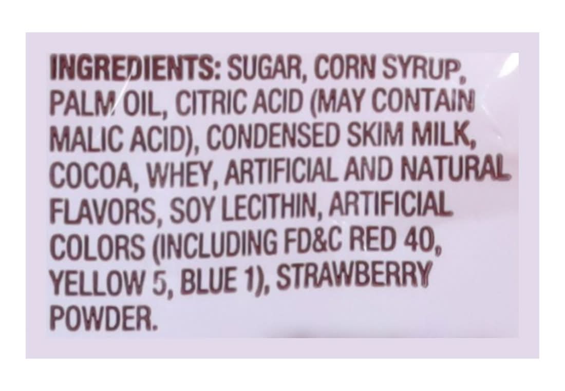 Ingredients: Sugar, Corn Syrup, Palm Oil, Citric Acid (May Contain Malic Acid), Condensed Skim Milk, Cocoa, Whey Artificial and Natural Flavors, Soy Lecithin, Artificial Colors (Including FD&C Red 40, Yellow 5, Blue 1), Strawberry Powder. Contains: Corn, Milk, Soybeans