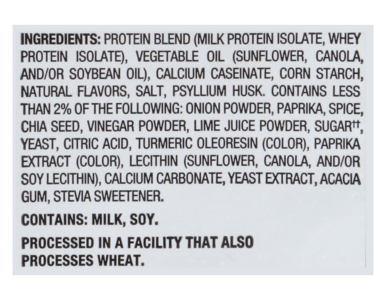 Ingredients: Protein Blend (Milk Protein Isolate, Whey Protein Isolate), Vegetable Oil (Sunflower, Canola, and/or Soybean Oil), Calcium Caseinate, Corn Starch, Natural Flavors, Salt, Psyllium Husk, Contains Less than 2% of the Following: Onion Powder, Paprika, Spice, Chia Seed, Vinegar Powder, Lime Juice Powder, Sugar(a), Yeast, Citric Acid, Turmeric Oleoresin (Color), Paprika Extract (Color), Lecithin (Sunflower, Canola, and/or Soy Lecithin), Calcium Carbonate, Yeast Extract, Acacia Gum, Stevia Sweetener. (a) Adds a Trivial Amount of Added Sugars Contains: Milk, Soybeans, Wheat Additives: Genetically Modified Ingredients