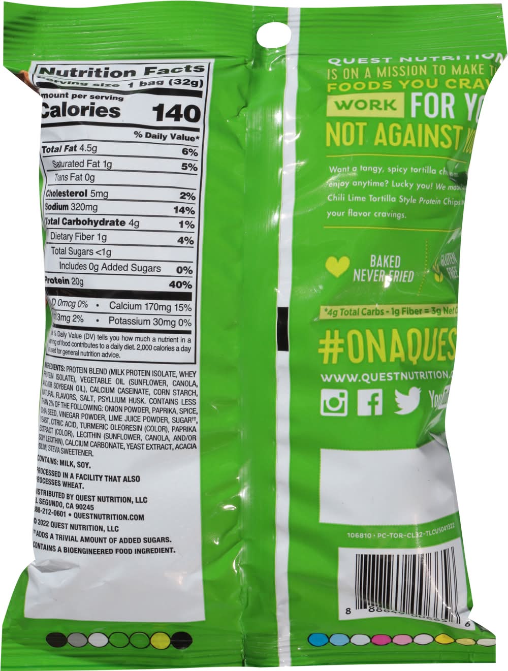 ENJOY MORE. CARB LESS: The Quest Nacho Cheese Tortilla Style Protein Chips provide all the crunch and satisfying taste of a regular tortilla chip. Only ours have 18g of protein and 4g net carbs per bag CRUNCH INTO COMPLETE PROTEINS: The Quest Nacho Cheese Tortilla Style Protein Chips are made with complete, dairy-based proteins to provide your body with 9 essential amino acids SALTY, SAVORY, CRUNCHY: Quest Nacho Cheese Tortilla Style Protein Chips are seasoned to perfection BAKED, NEVER FRIED: Flavor: Chili lime