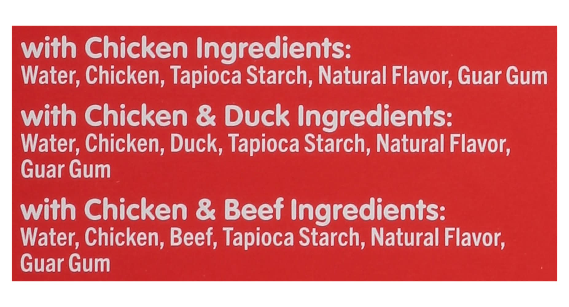 Ingredients: With Chicken: Water, Chicken, Tapioca Starch, Natural Flavor, Guar Gum. With Chicken & Duck : Water, Chicken, Duck, Tapioca Starch, Natural Flavor, Guar Gum. With Chicken & Beef: Water, Chicken, Beef, Tapioca Starch, Natural Flavor, Guar Gum