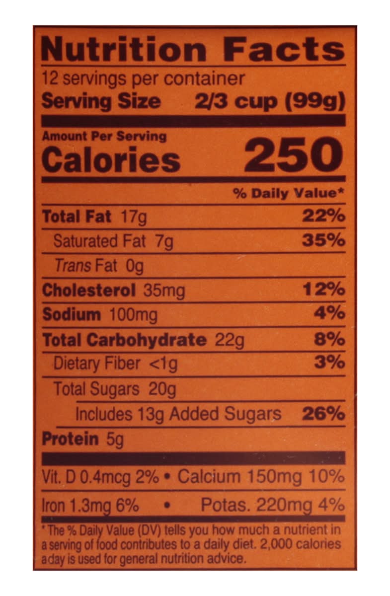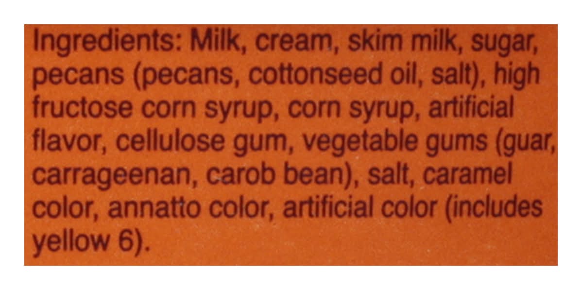 Ingredients: Milk, cream, skim milk, sugar, pecans ( pecans, cottonseed oil , salt) high fructose corn syrup, corn syrup, aritificial flavor, cellulose gum, vegetable gums ( guar, carrageenan, carob bean), salt, caramel color, annatto color artificial color. Contains: Milk, Tree Nuts, Pecans, Corn